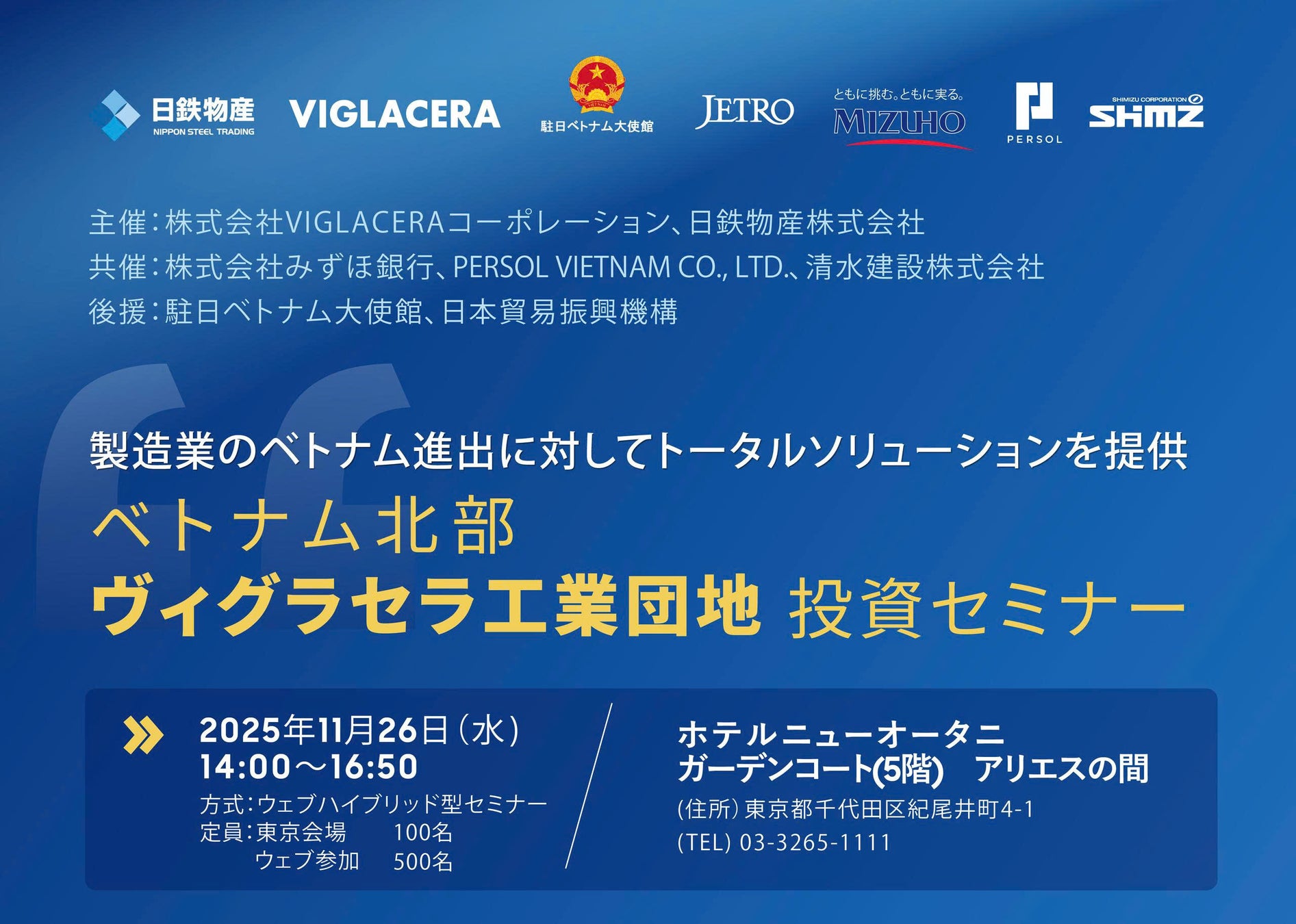 日鉄物産株式会社(以下、「当社」)は、11月26日(水)にホテルニューオータニ東京にて、オンラインと会場参加を組み合わせたハイブリッド型のベトナム投資セミナーを開催します。本セミナーは、当社と販売代理店契約を締結しているベトナム北部最大手の工業団地事業者である株式会社VIGLACERAコーポレーション(以下、「ヴィグラセラ社」)と共同で主催いたします。