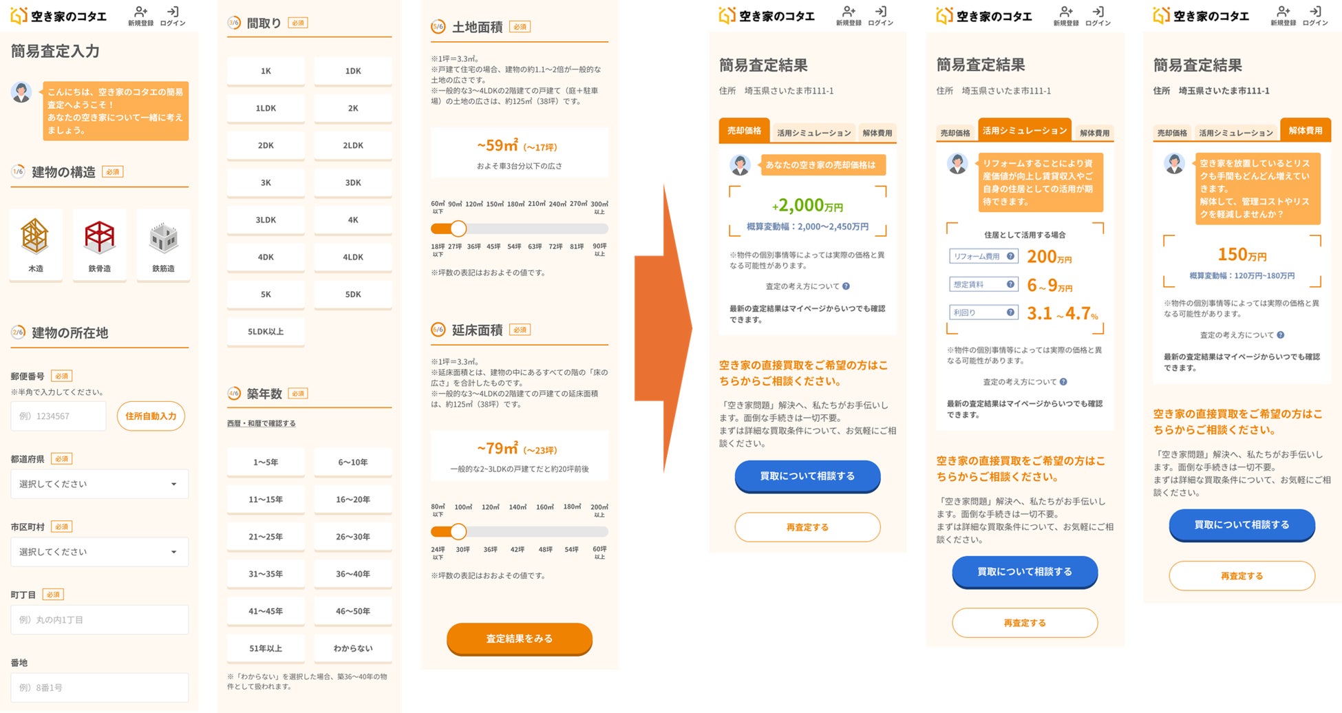 本サービスでは、入力項目を所有者が迷わず回答できる内容に厳選し、手軽さにこだわりました。Web上で物件の所在地や築年数、構造、延床面積などの基本情報を入力するだけで、AIが空き家の価値を多角的に算出し、売却した場合の想定価格や、賃貸・リノベーションによる活用を想定した収益シミュレーション、さらには解体にかかる概算費用までを提示します。これにより、空き家所有者は、納得感をもって複数の選択肢を比較・検討することが可能となります。