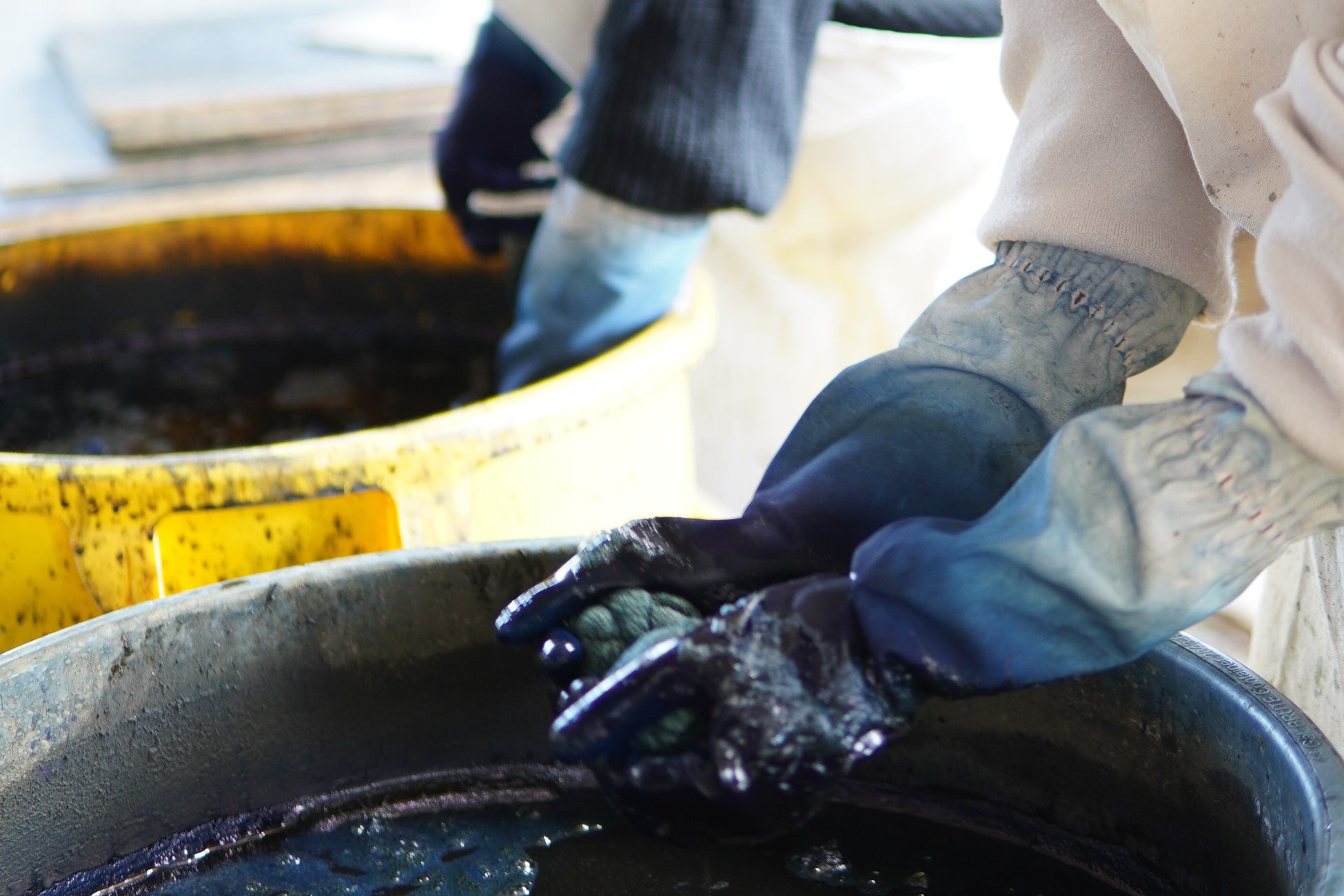 ※天然灰汁発酵建とは…化学薬品を使用せず天然の材料のみを用い、手間ひまをかけて藍染液を作る方法