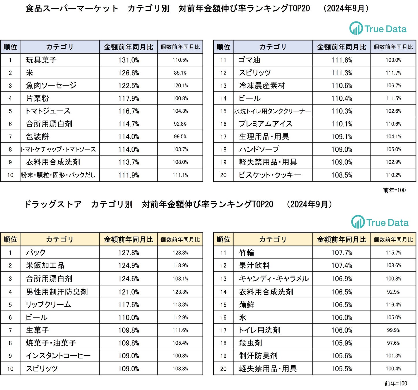 ~ドラッグストア、食品スーパーマーケット 対前年伸び率TOP20カテゴリを発表【 2024年9月 】~