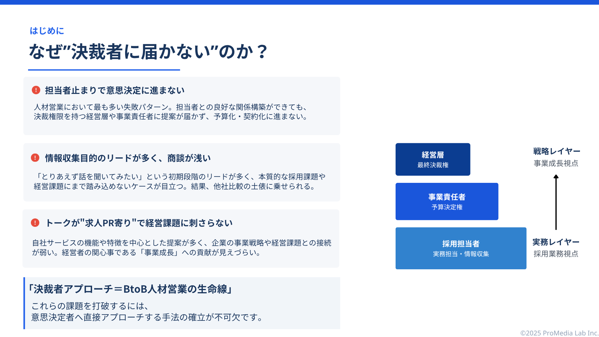 株式会社プロメディアラボ(本社:東京都中央区、代表取締役:廣瀬義憲)は、人材業界の営業現場が抱える「決裁者に届かない」「アポ率が低い」「トークが属人的」といった課題を解決するための資料『人材営業の再現性を高める “決裁者アプローチ術”』を無料公開しました。