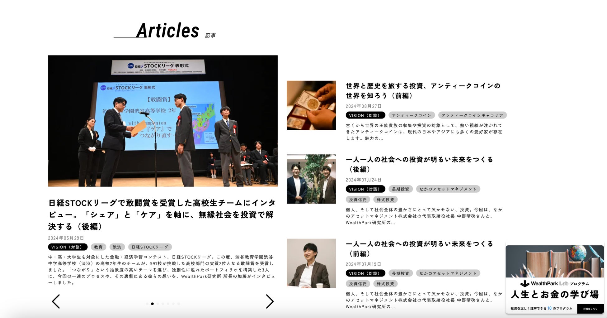 WealthPark研究所の公式ウェブサイトでは、「投資の本質」を伝えるコラムや、アート・教育・建築などを題材に社会と投資の繋がりを見つめ直す記事を発信してきました。今回の全面リニューアルでは、そうした記事発信の背景にあるWealthPark研究所の概要や活動内容、過去の活動実績、提供している講義・ワークショップなどのメニューなどを加え、各情報のアクセスビリティの改善を行いました。