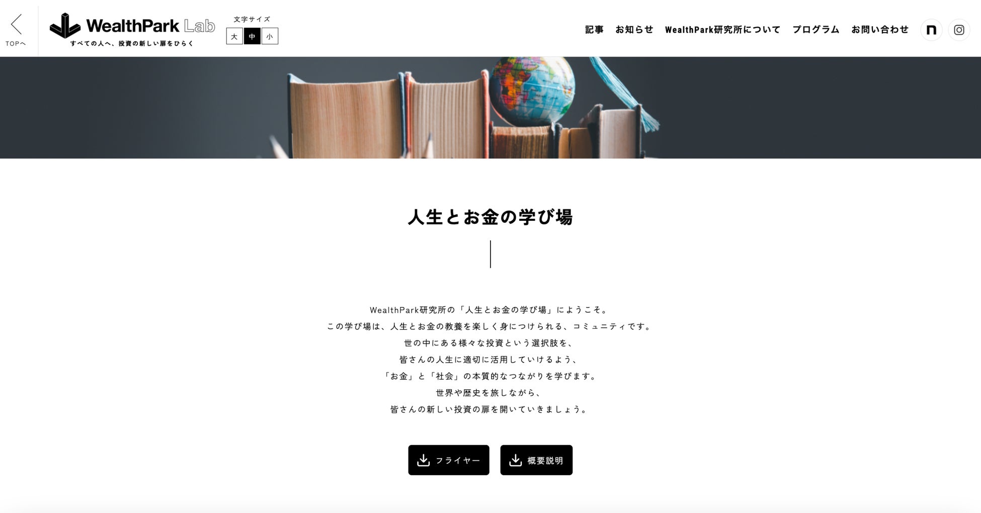 世の中にある投資という選択肢を、それぞれの人生に適切に活用していくことを応援するコミュニティです。日本人から外国人、中高生からシニア層、投資の初心者からベテランまで、数千名へ提供してきたWealthPark研究所のオリジナルコンテンツを再構築し、10のテーマから社会、歴史、自分の本質を知ることで、世の中の仕組みや自らにとって必要な投資が学べます。