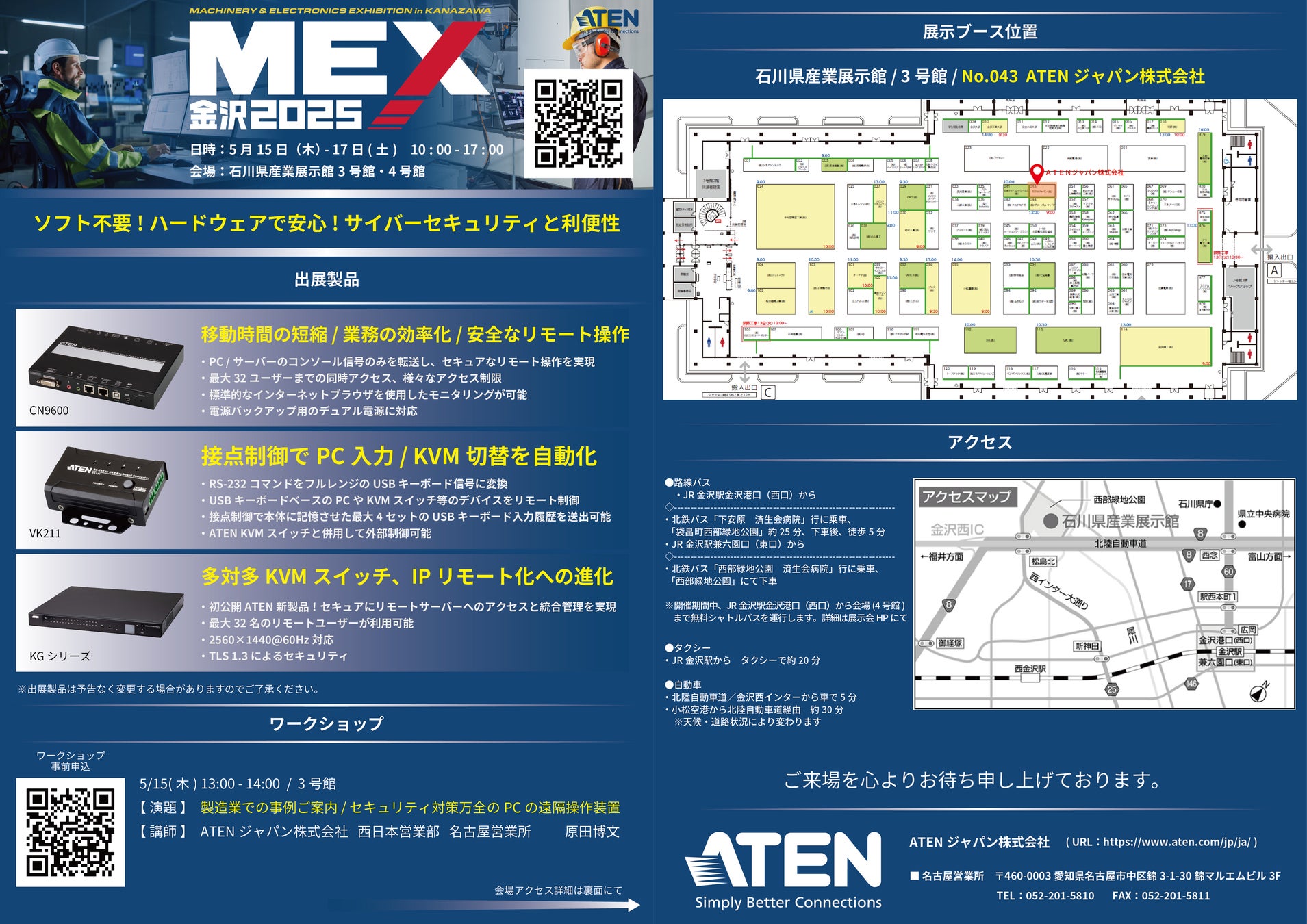 ATENジャパン株式会社(取締役社長:鄧 鴻群 (Hans Teng))は、「ソフト不要!ハードウェアで安心!サイバーセキュリティと利便性」というテーマで、5月15日(木)~17日(土)に石川県産業展示館で開催される「MEX金沢2025」に出展します。