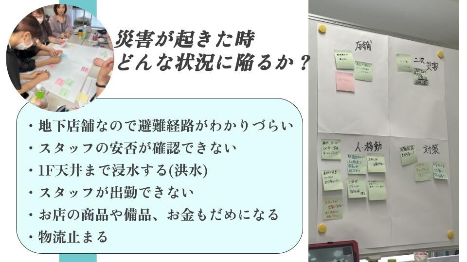 自宅や勤務先の環境やリスクを把握していなければ必要となる備えも検討できないことから、昨年のセミナーは「知る」をテーマにまずは自分たちの環境やリスクを把握することからスタート。「重ねるハザードマップ」を利用して自宅や勤務先店舗の被害想定リスクを実際に検索したり、想定をもとに店舗運営において何が起きうるかを話し合うグループワークを実施しました。
