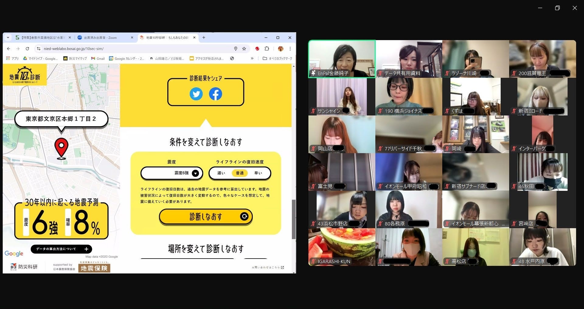 前回は主に水害被害に対しての内容が中心となったが今回はハザードマップ以外にも「地震10秒診断」や「東京備蓄ナビ」など様々な防災ツールを活用し、店舗と自宅のリスクを調査するワークショップを行いました。