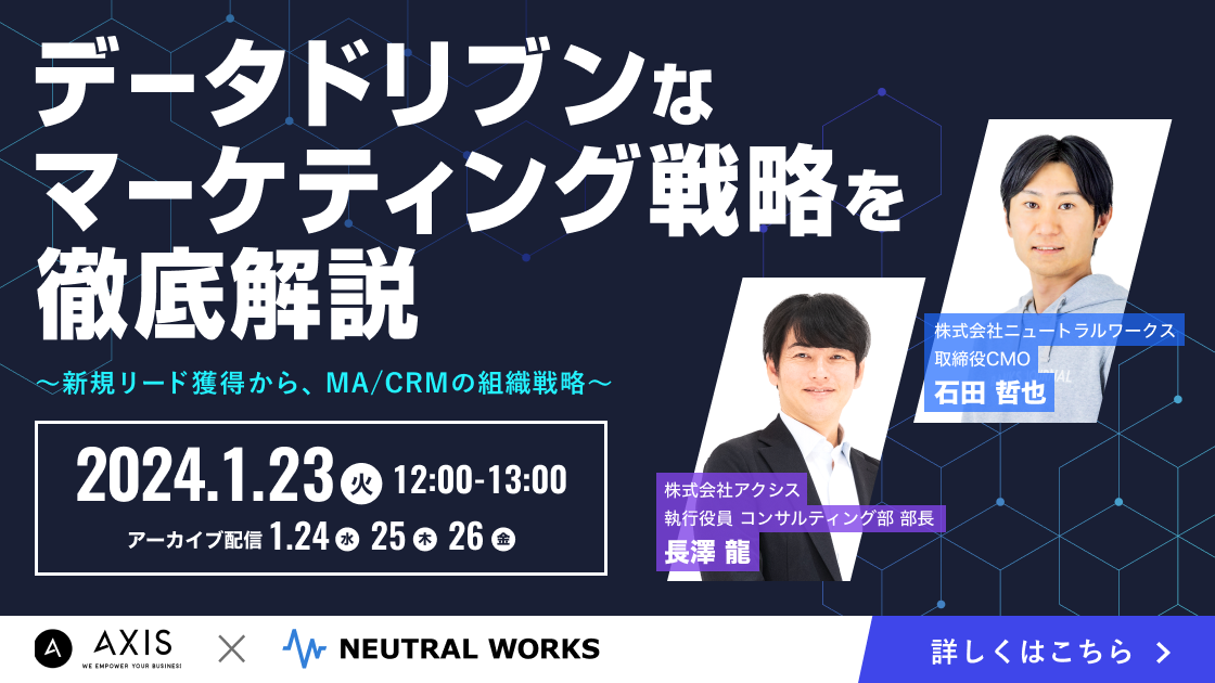 【1/23無料ウェビナー】成果最大化の勝ちパターン!データドリブンなマーケティング戦略を徹底解説〜新規リード獲得から、MA/CRMの組織戦略〜