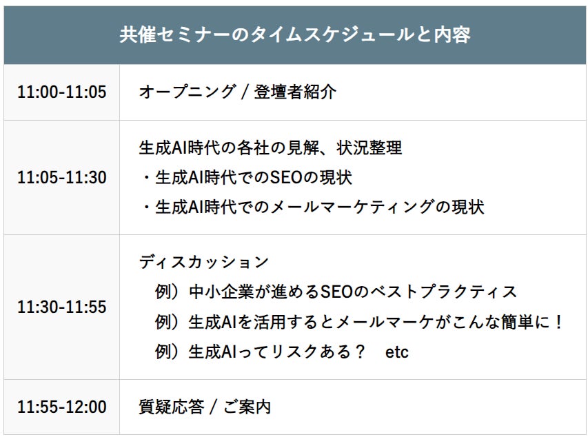 生成AIを活用したマーケティング企業2社によるオンラインセミナー。「生成AIが切り拓く未来:中小企業のためのSEO / メールマーケティング新戦略」というテーマで9月12日(木)開催