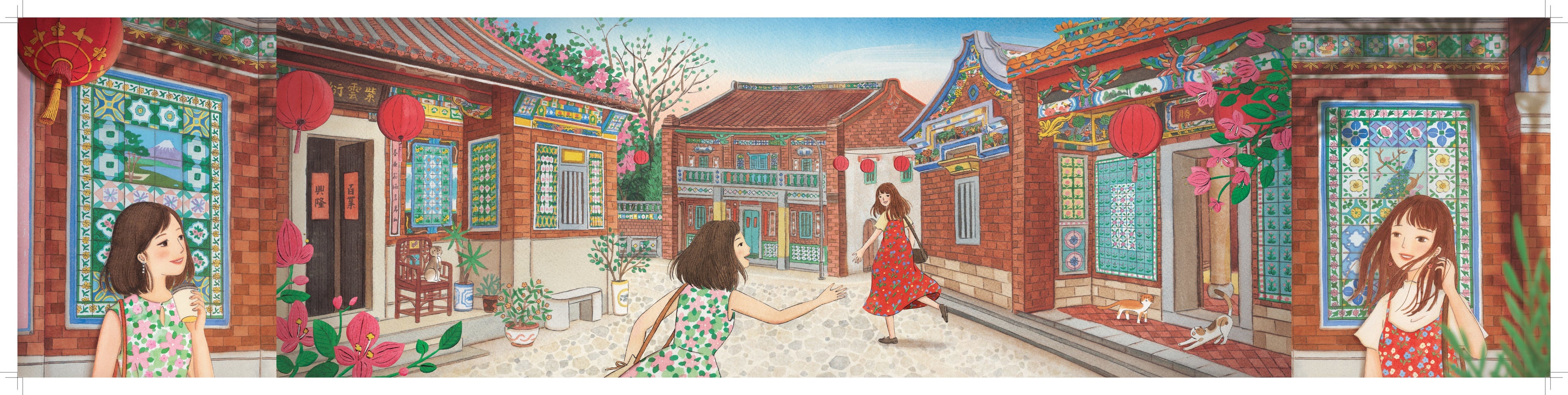 今回のイラストは「マジョリカタイル文化」、「旅」、「友情」から発想を得て、2人の女性を登場させた。一人は台湾人の女性、もう一人は日本人の女性で、2人は仲良し。新型コロナウイルスの影響で長らく会うことができず、久しぶりに日本から台湾を訪れ、2人が一緒に台湾のマジョリカタイルの建物が並ぶ古い街並み巡りをしているというイメージで、マジョリカタイルの装飾が特徴的な金門黄天露古宅、新北三重先嗇宮、高雄許家古宅などをモデルに描いた。