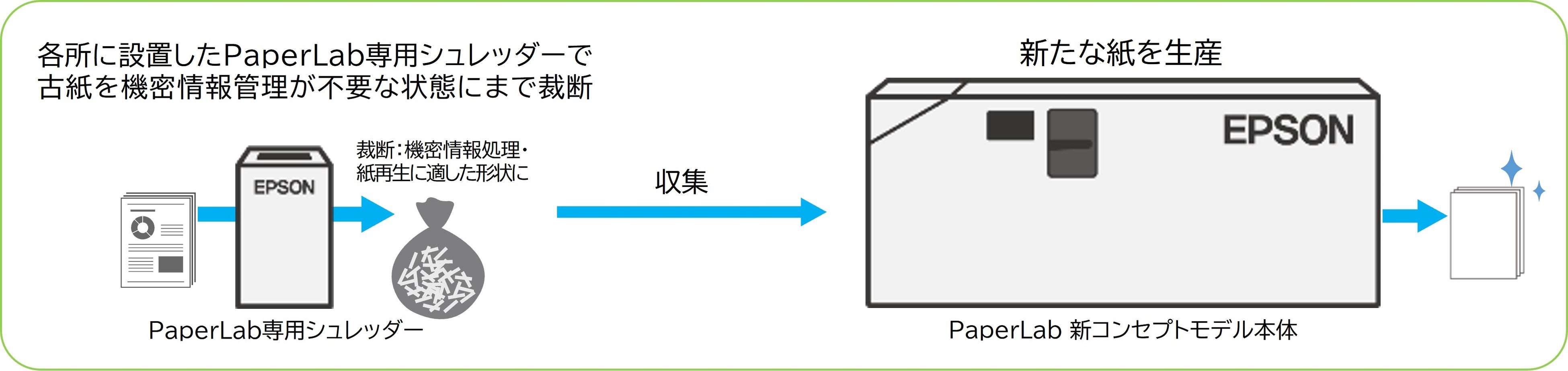 各所に設置されたPaperLab専用シュレッダーで裁断した古紙は、「新コンセプトモデル」の本体がある場所へ集約され、新たな紙に生まれ変わります。このプロセスにより、複数の企業間や自治体を中心とした地域社会の皆さまをつなぐ、新たな紙循環サイクルの実現を目指します。
