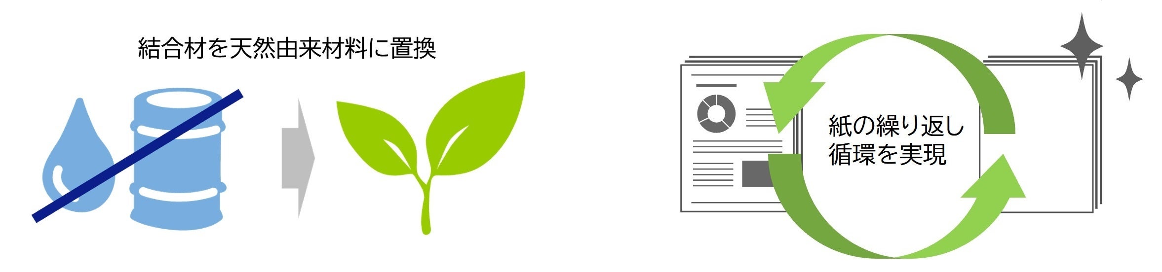 新たな紙の再生工程において、繊維化した古紙を結合する際に使用する「結合材」を天然由来の材料に置き換えます。また、「新コンセプトモデル」で再生した紙を繰り返し循環できるようにすることで、更なる環境負荷の低減に貢献します。