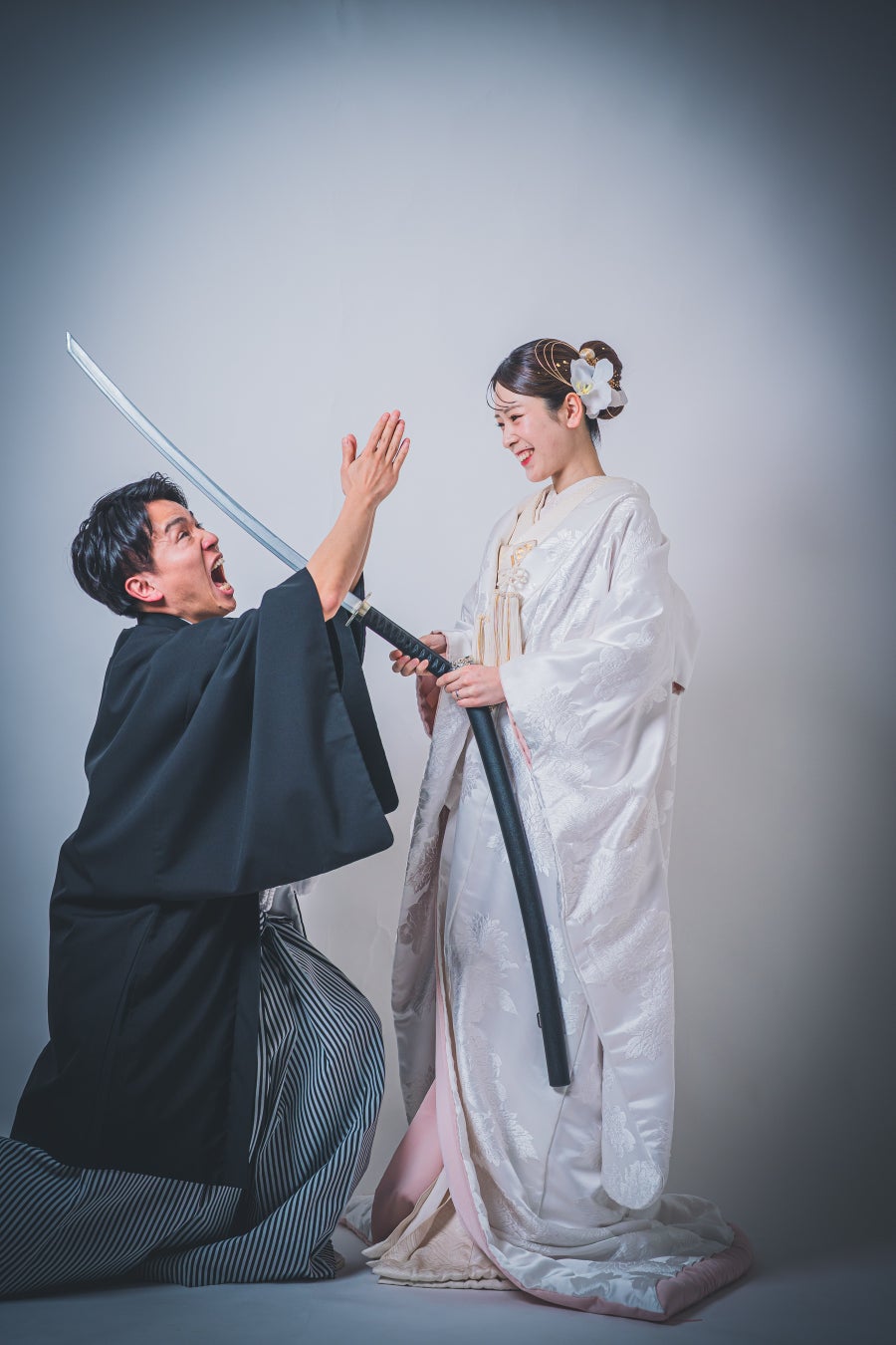 高品質な婚礼衣装: スタジオが厳選した本格的な色打掛や白無垢を、追加料金なしで選択可能。