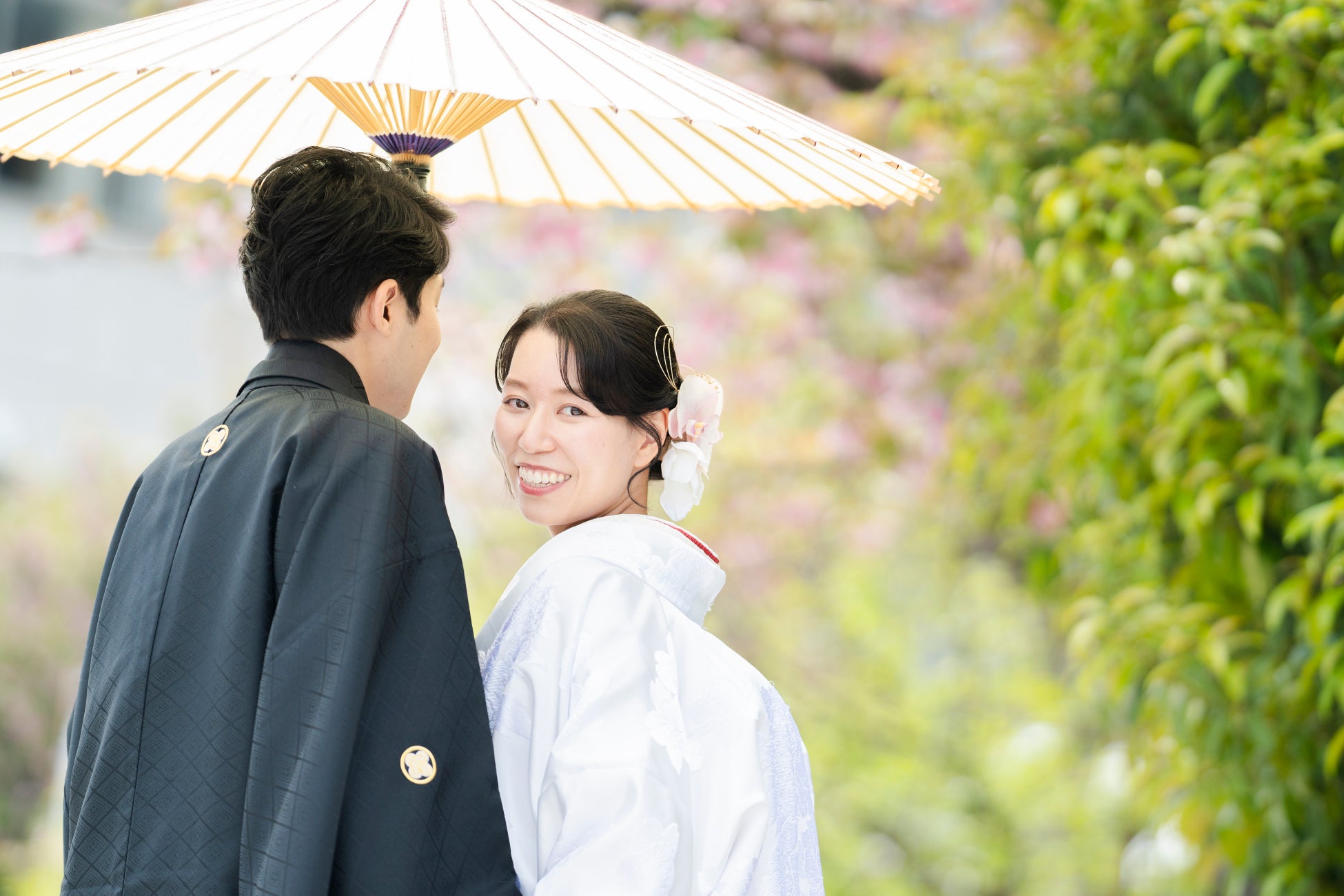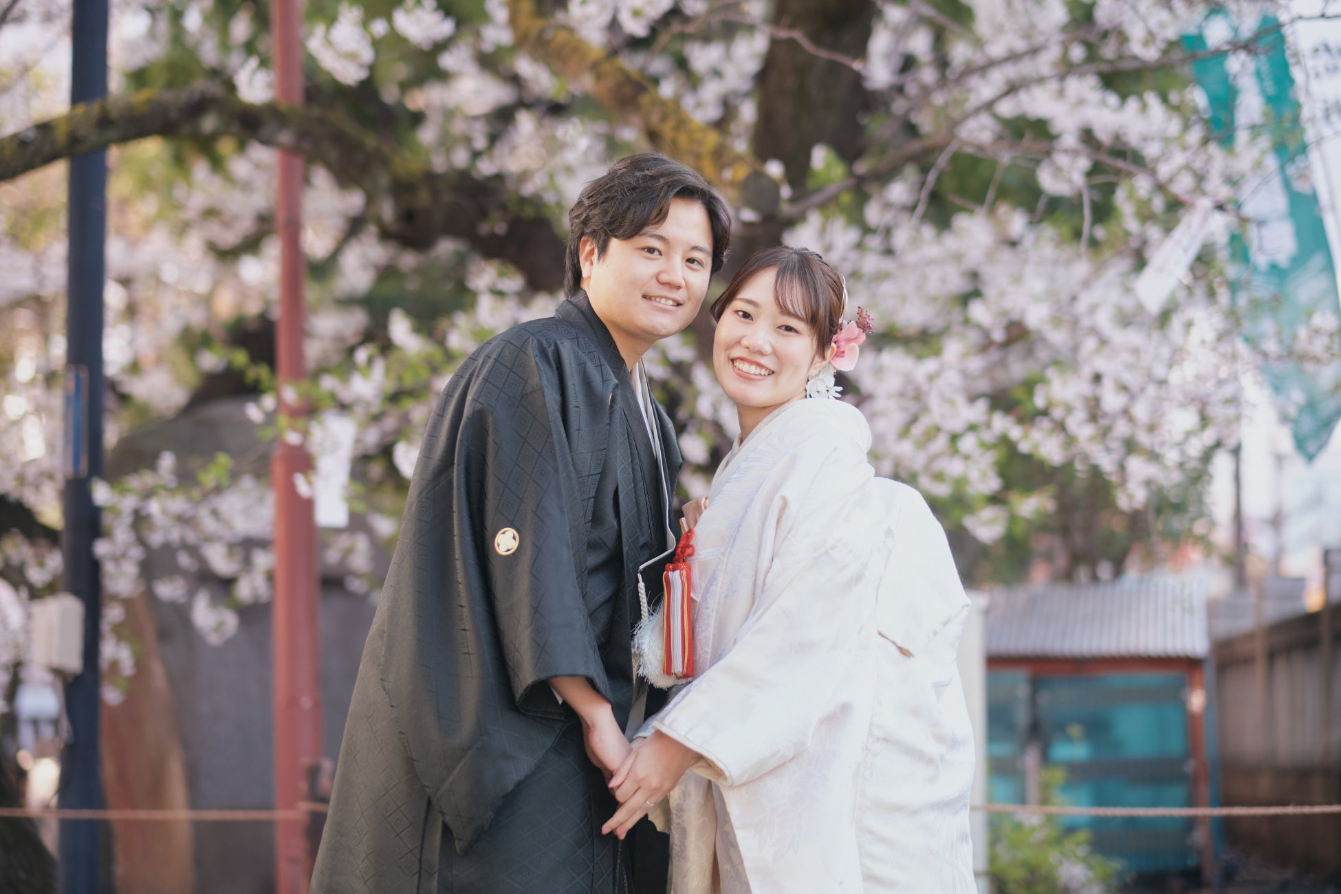 浅草店から徒歩圏内の隅田公園をはじめ、情緒あふれる浅草の街並みと桜を背景に撮影を行います。毎年、国内外から多くの観光客が訪れる桜シーズンにおいて、比較的混雑を回避しやすい撮影スポットの選定や動線の確保を行うことで、お二人の大切な時間を最大限に守りながら撮影を進行いたします。