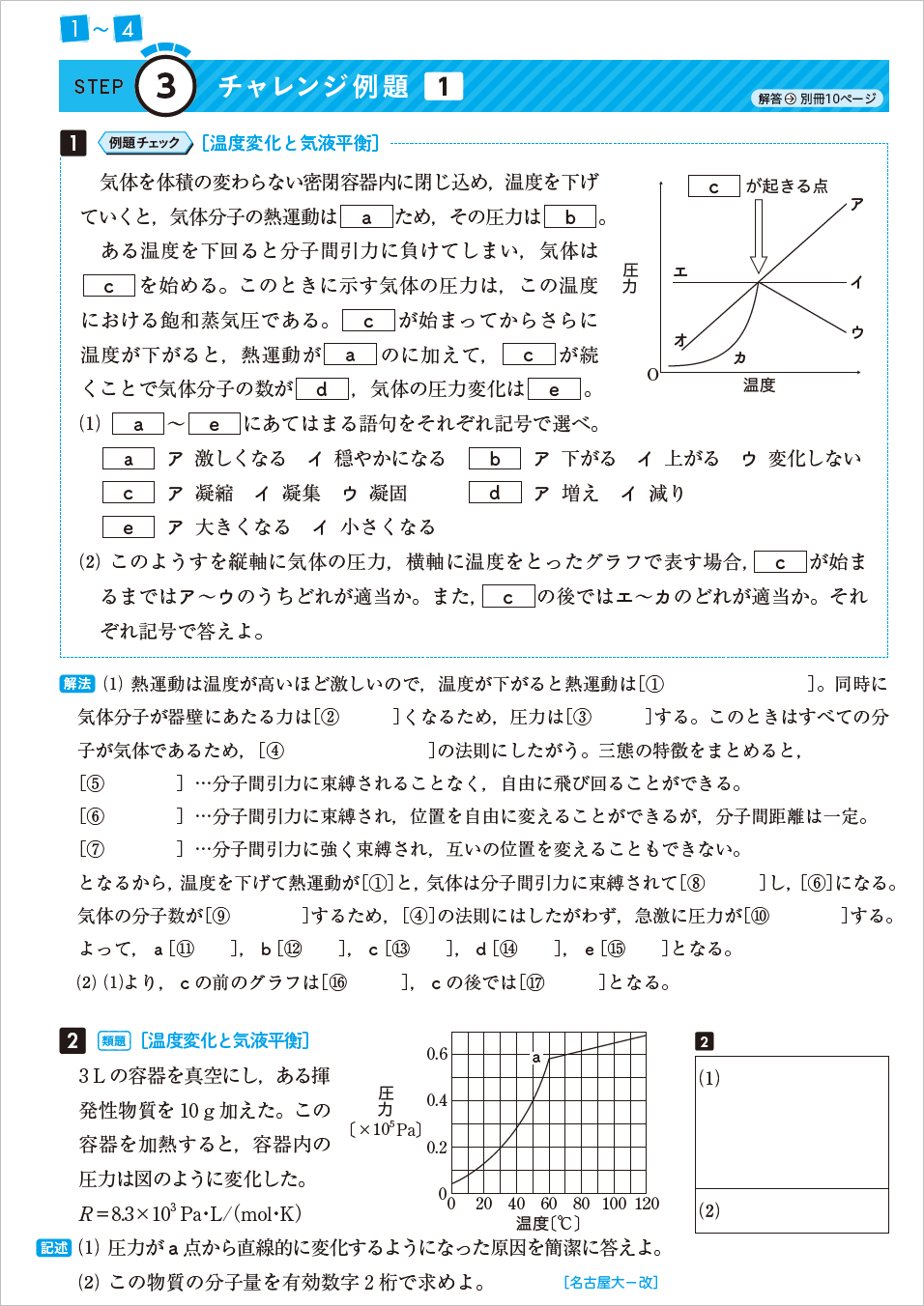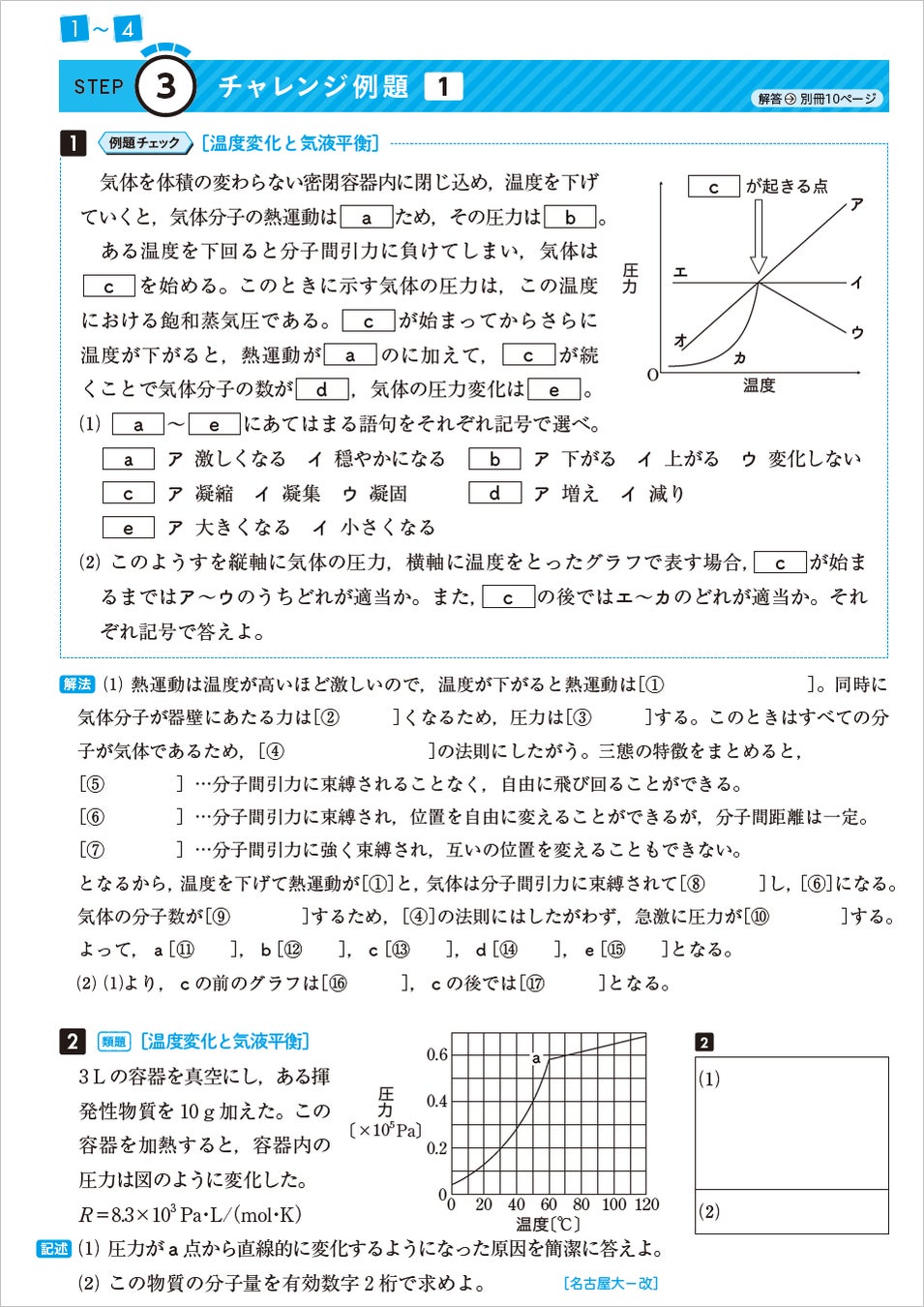 化学/生物のSTEP3のチャレンジでは、例題で考え方・解き方を穴埋めで確認してから力試しの問題へ。
