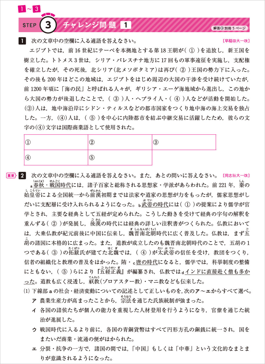 1つの単元をSTEP1/STEP2の2段階でしっかり力をつけ、章末のSTEP3で発展レベルのチャレンジ問題に挑みます。