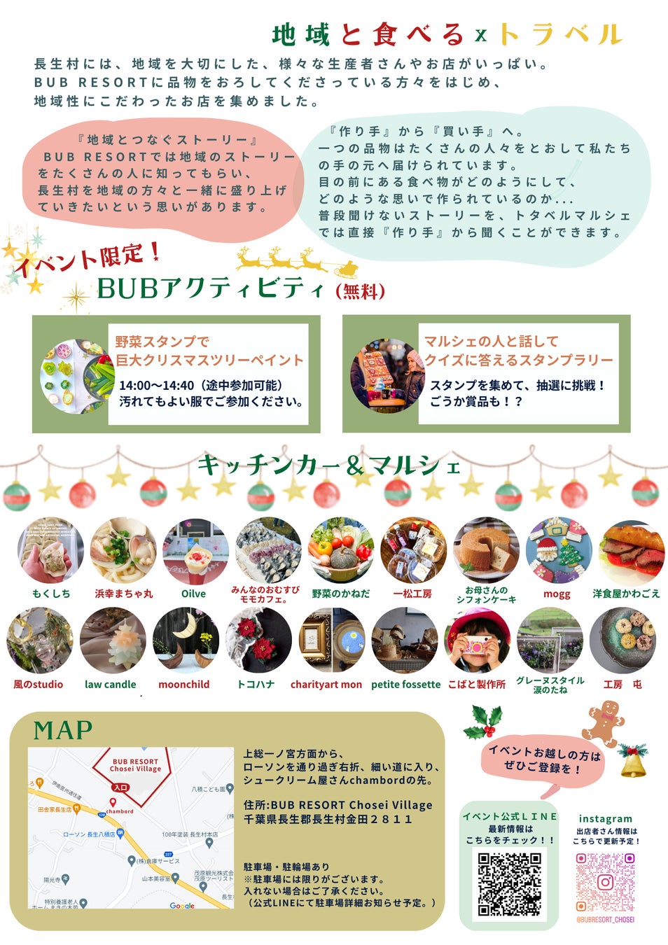 千葉県長生郡に位置するBUB RESORT Chosei Villageでは、2023年12月10日(日)、長生村の魅力を凝縮した「トタベルマルシェ ~クリスマスマーケット~」を開催いたします。通常は宿泊者限定の当施設を一般開放し、長生村付近のマルシェやキッチンカーによる出店に加え、BUB RESORTオリジナルの限定アクティビティも開催します。地域の生産者様と訪れる皆様が交流できる、特別なイベントです。