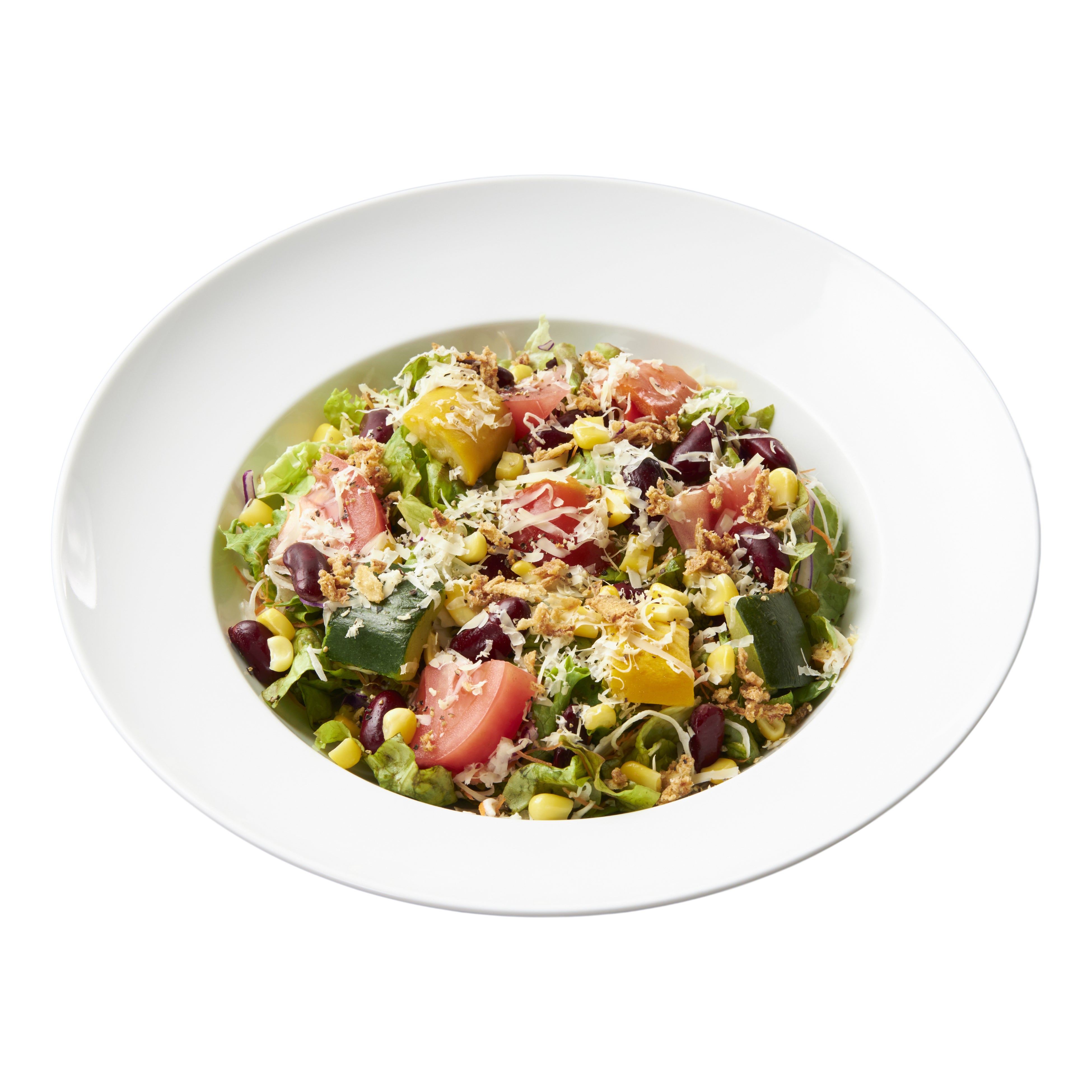 鮮やかなビタミンカラーの夏野菜や、レッドキドニー、コーンなど様々な食感を味わえます。トッピングのスモーク香るプラントベースチーズとフライドオニオンが、風味と食感アクセントです。選べるオリジナルドレッシングでお楽しみください。