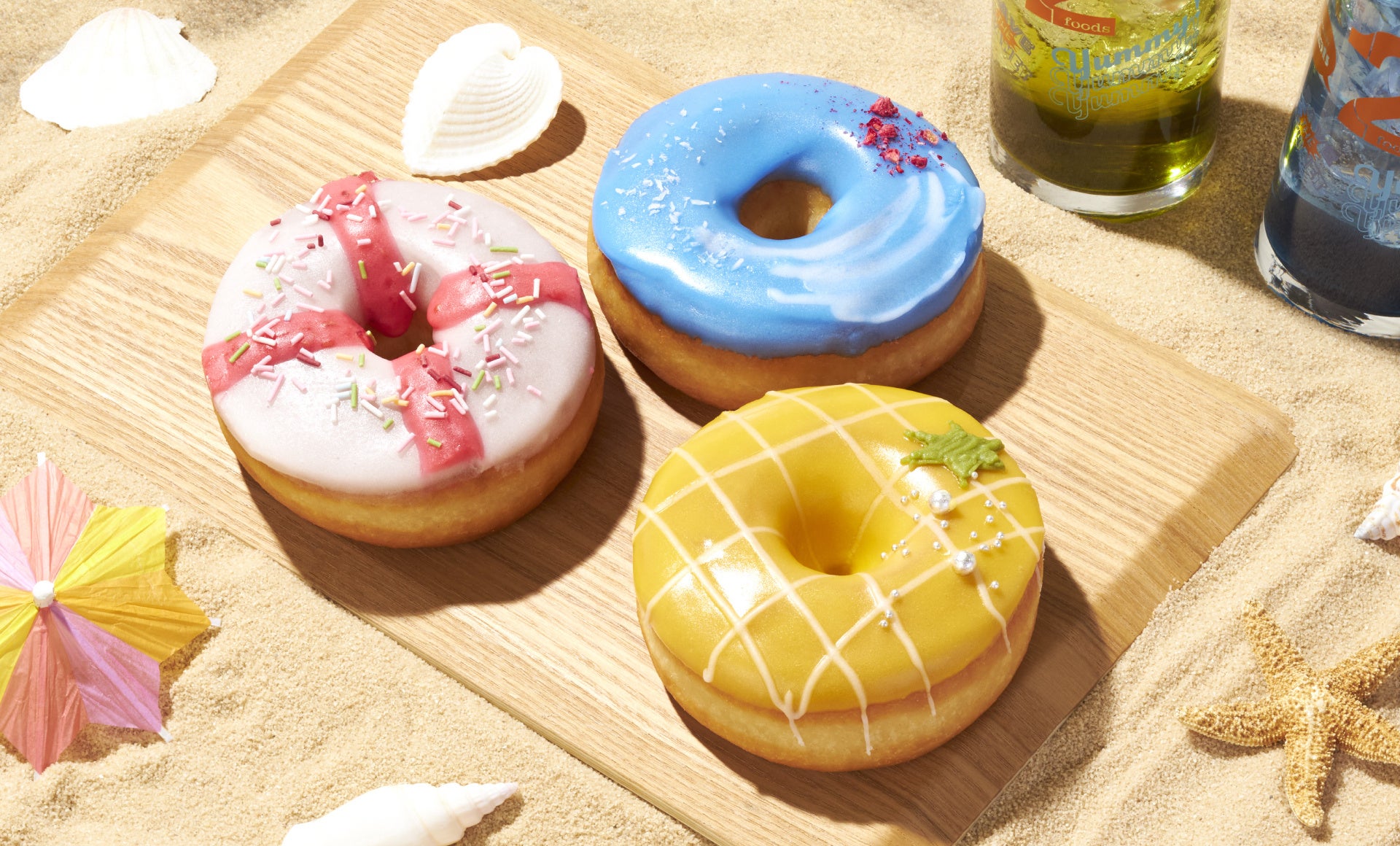 「サンシャインパインドーナツ」はパインの甘酸っぱさやトロピカルな香りが口いっぱいに広がり、「サマービーチフロートドーナツ」はジューシーなピーチと甘酸っぱいラズベリーを一緒に楽しむことができる一品です。鮮やかなブルーの「サンライズサーフィンドーナツ」は、ライチのさっぱりした甘みを程よく効いた塩が引き出し、夏の爽快感を楽しめます。