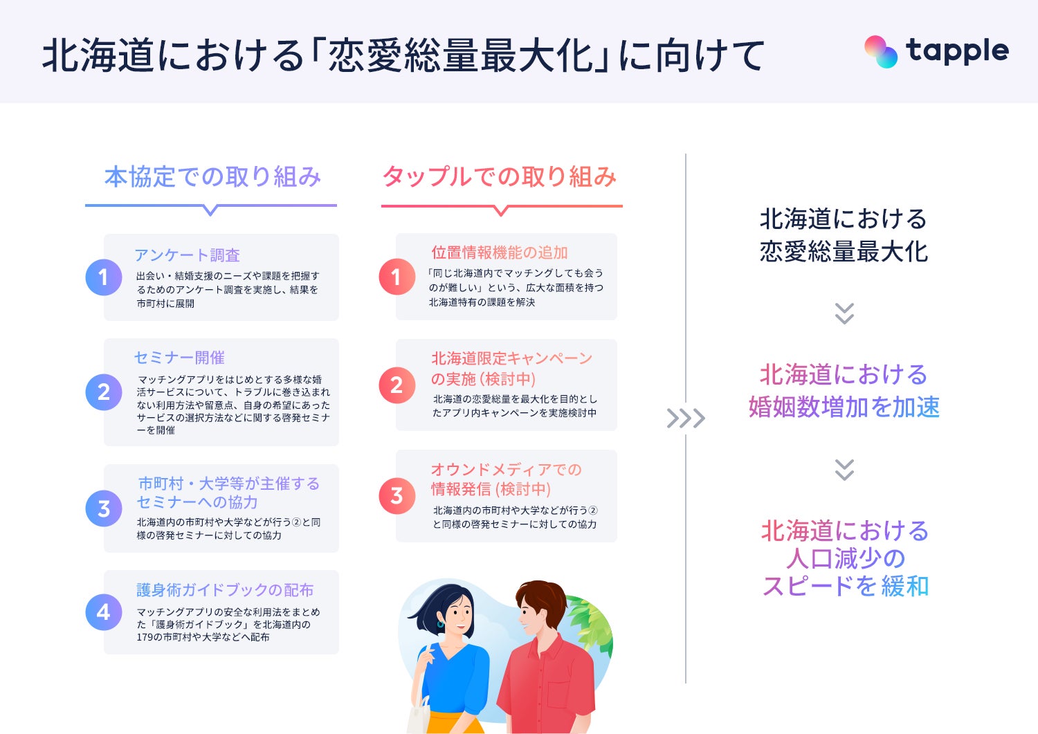 株式会社タップル(本社:東京都渋谷区、代表取締役社長:平松繁和)は結婚を希望する人の多様なニーズに応じた出会い・結婚支援に取り組むことを目的に、北海道(知事:鈴木直道)と「出会い・結婚支援に関する連携協定」を締結いたしました。「タップル」の恋活・婚活に関する知見やサービス特性を活かすことで、北海道での出会い・結婚支援の取り組みを実施いたします。
