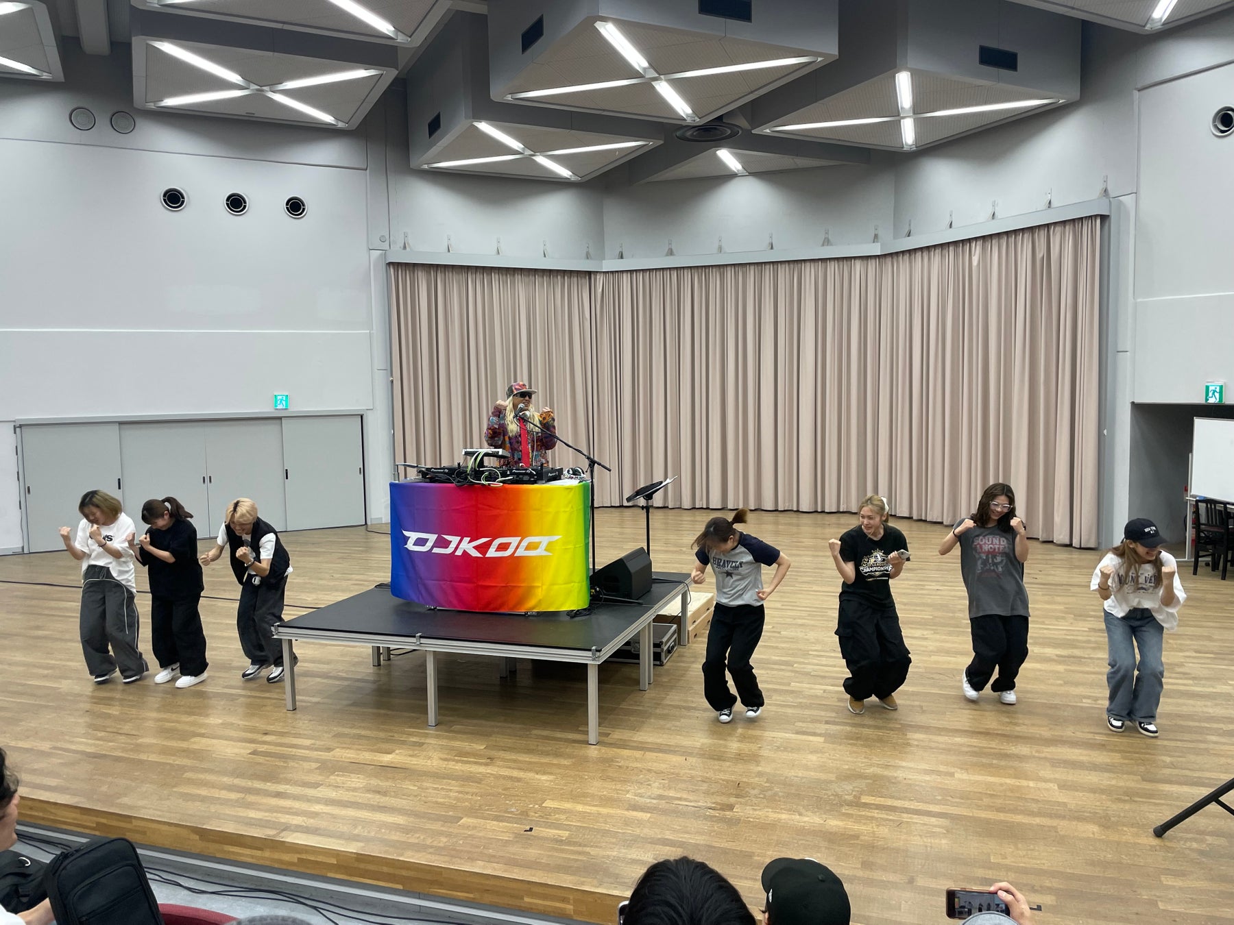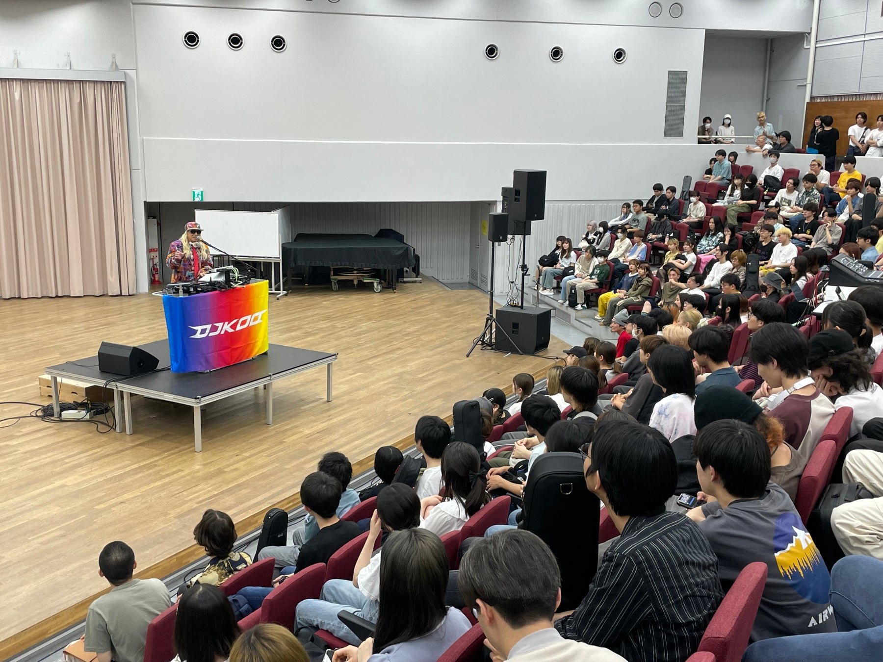 DJ KOO先生は最後に学生たちに向けて「僕らが音楽を始めたときは、ダンスミュージックやソウルミュージックは海外のもの、という当たり前があったけど、今では日本の40年前のシティポップが海外の大きなDJイベントでも当たり前になってきています。日本に生まれて日本のカルチャーに触れられていることを誇りに思います。DJを始めて今年で45年になりますが、なんで45年もやってこられたのかと思うと、ただ好きだからじゃなく、オーディエンスの人々とのつながりができているから続けられているんだと思います。DJはオーディエンスがあってこそ成り立つもの。安らぎを求めたい、つらい状況だけどハッピーになりたい、そんな気持ちを持つ人たちに音楽といっしょに楽しい空気を作りたい、これを大切にDJをやっています。学生の皆にも人とのつながりを大切に、自分らしく楽しく発信をしていってほしいなと思います。」と語りました。