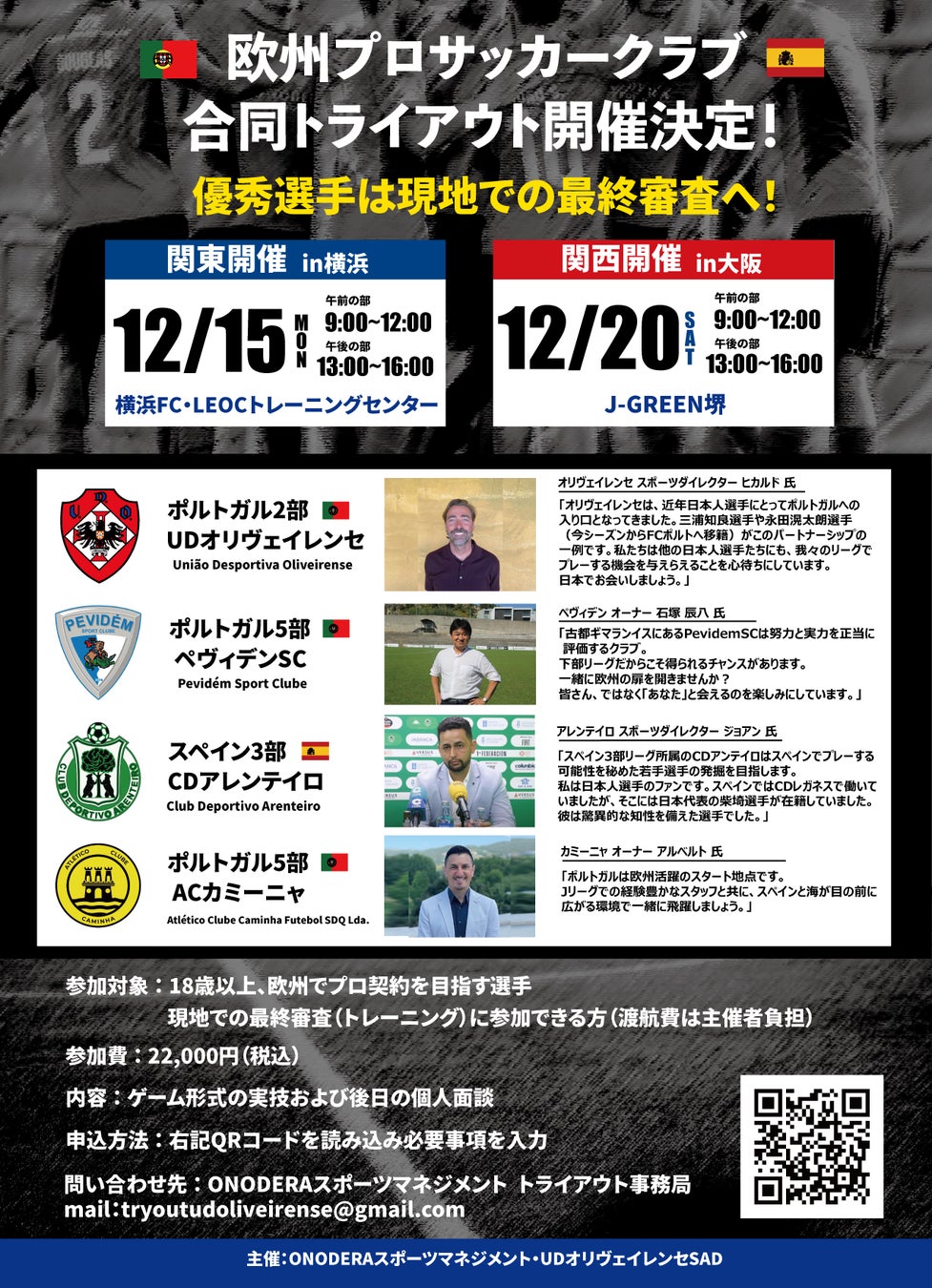 このたび、より多くの選手に欧州挑戦の機会を提供すること、2026-27シーズン以降のクラブ強化を目的として、ポルトガルリーグ所属のUDオリヴェイレンセとペヴィデンSC、ACカミーニャ、スペインリーグ所属のCDアレンテイロの4クラブが参加する合同トライアウトを、関東と関西の2拠点で開催し日本での1次審査合格者を現地での最終審査(トレーニング参加)へ招待いたします。