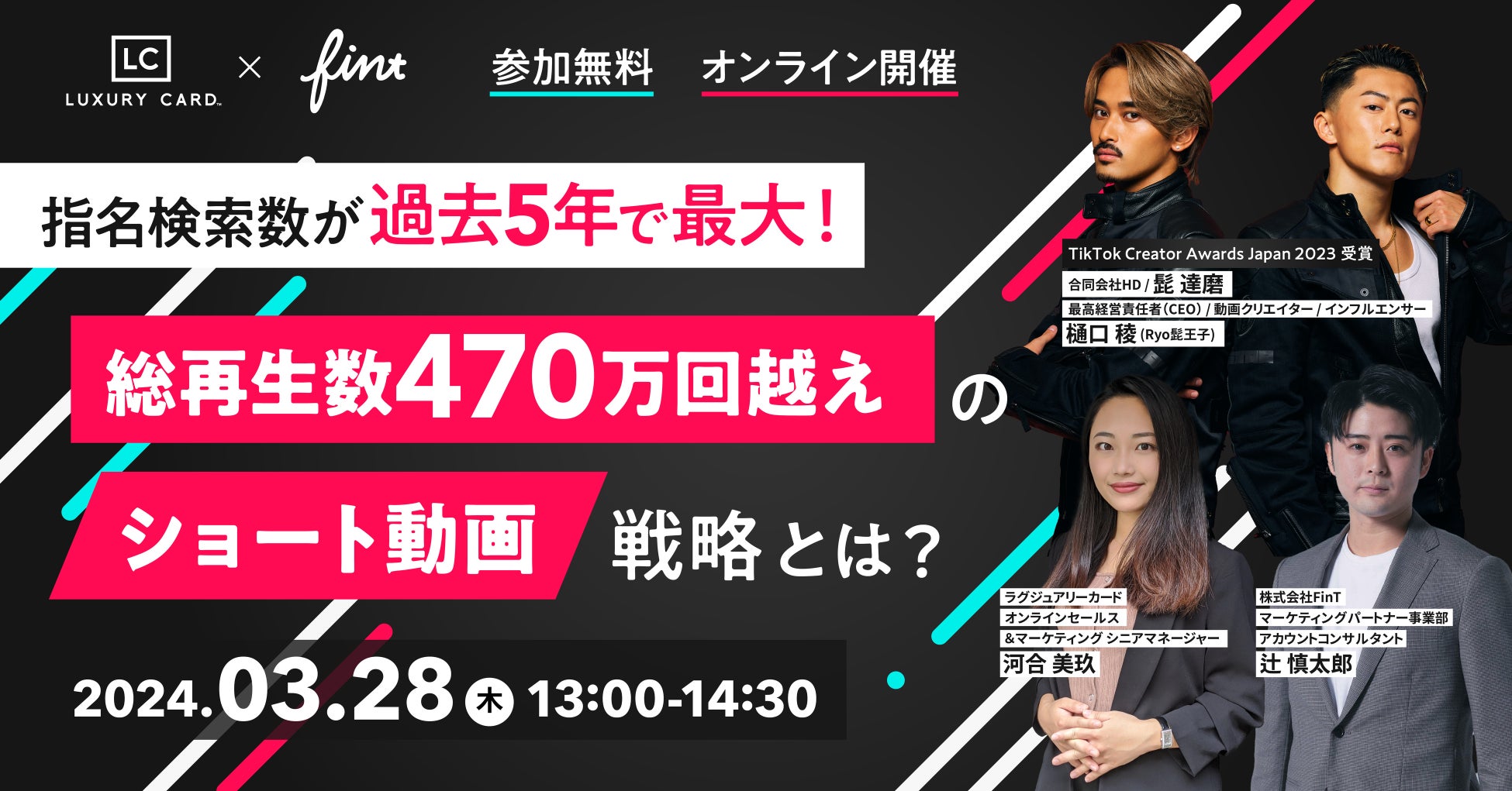 株式会社FinT(本社:東京都渋谷区、代表取締役:大槻 祐依)は3月28日(木)13:00〜14:30より、指名検索数が過去5年最大!総再生数470万回越えのショート動画戦略とは?と題してインフルエンサーとして活躍する髭達磨、ラグジュアリーカードと3社で共催ウェビナーを開催いたします。