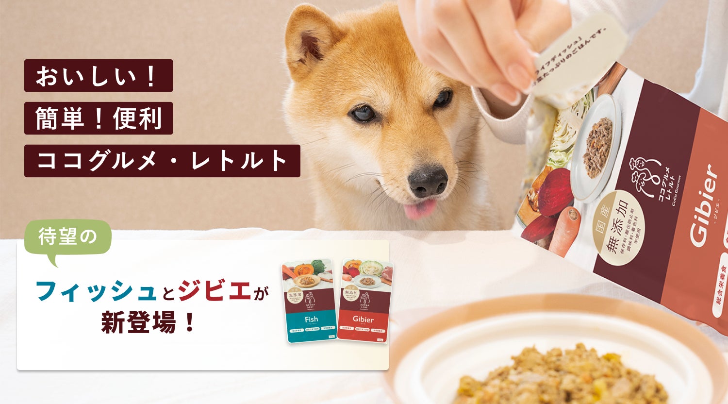 愛犬用手作りごはん「ココグルメ」シリーズから、大好評につき、手軽な常温タイプ「ココグルメ・レトルト」にジビエとフィッシュが新発売