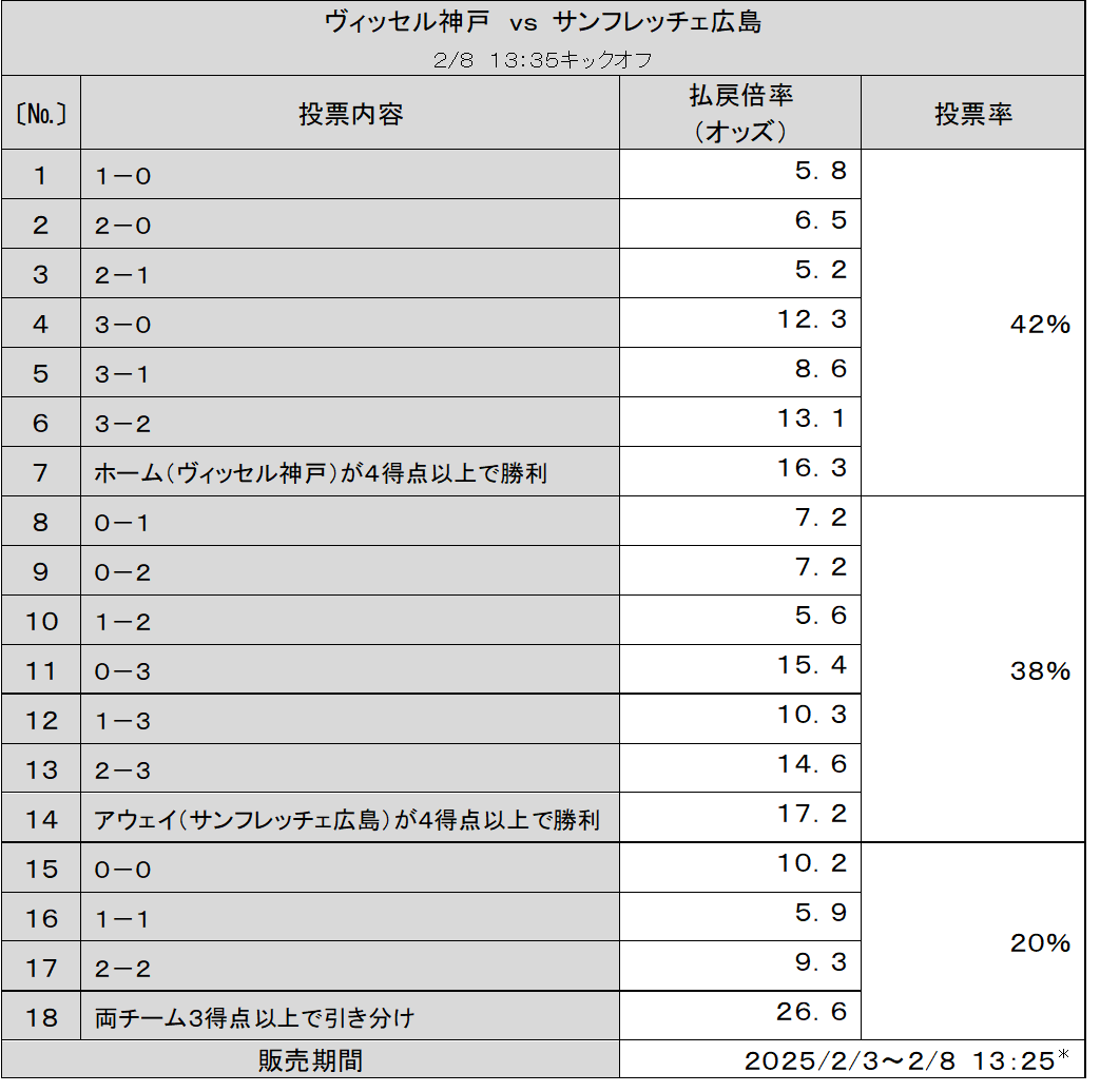 ※1 2月7日(金)10時時点の投票状況となります。払戻倍率(オッズ)は、投票状況により販売終了まで変動します。払戻倍率(オッズ)は、スポーツくじオフィシャルサイト(https://www.toto-dream.com/)で随時更新しています。