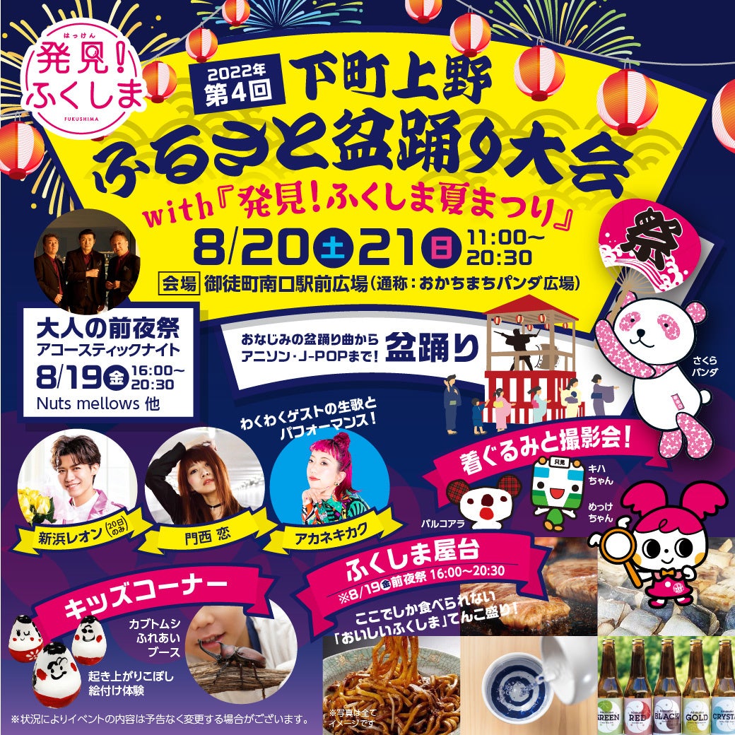 株式会社スペースワン(本社:福島県郡山市)は、福島県産品のおいしさや魅力を消費者の皆様に発信するオンラインストア「ふくしま市場」を運営。この度、東京電力ホールディングス株式会社から委託を受け、8月20日(土)・8月21日(日)の2日間、おかちまちパンダ広場で主催:御徒町駅南口商店会の盆踊りイベントを3年ぶりに開催いたします。下町上野と福島をつなぐイベントには、迫力のアーティストステージ、体験型のキッズコーナーや着ぐるみとの撮影会、美味しいふくしまグルメ屋台が勢ぞろい!そして、8月19日(金)の夜は、まったりと音楽とお酒を楽しむ大人の前夜祭も開催。