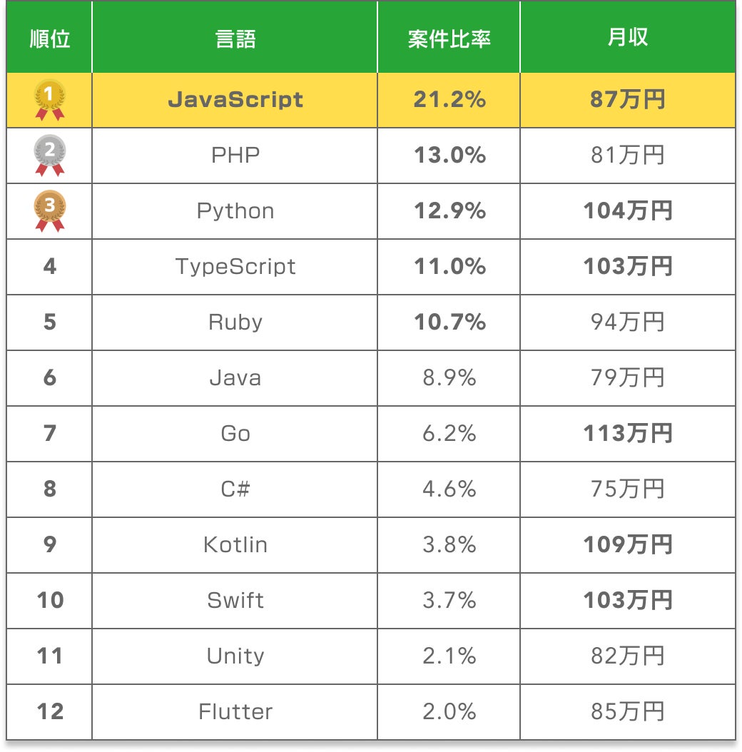 案件数ランキング1位!平均年収1,040万!JavaScript|フリーランス副業調査