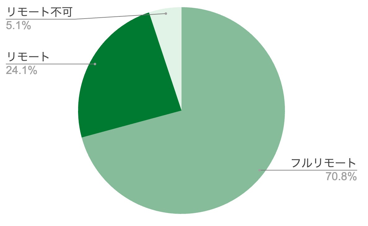 JavaScriptの案件では、リモートワークが広く浸透していることがわかります。全体の70.8%がフルリモート(在宅OK)となっており、場所に縛られない柔軟な働き方が可能です。また、24.1%の案件では一部リモートが認められています。
