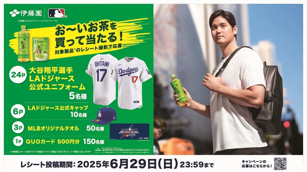 5月19日(月)より、コンビニエンスストアや量販店などで、「お〜いお茶」製品を購入した方に、MLB™オールスターゲームに向けて、大谷選手のユニフォームやロサンゼルス・ドジャースキャップ、タオル、QUOカードをプレゼントする、『大谷翔平選手応援グッズなどが当たる!キャンペーン』を展開します。