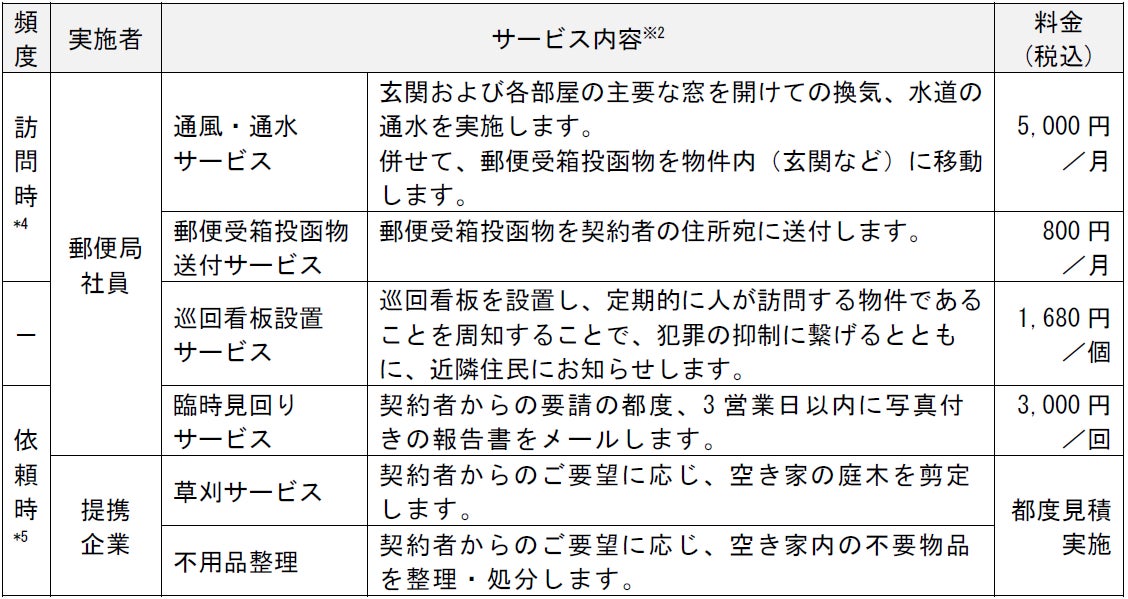 日本郵便は、2025年1月に「郵便局の空き家みまもり」を開始いたしました。物件の状況を定期的に確認し、その結果を利用者様に報告するサービスの他、通風・通水サービスをはじめとした、多様なオプションサービスもご用意し、空き家の適正管理の一助としてご利用いただいております。