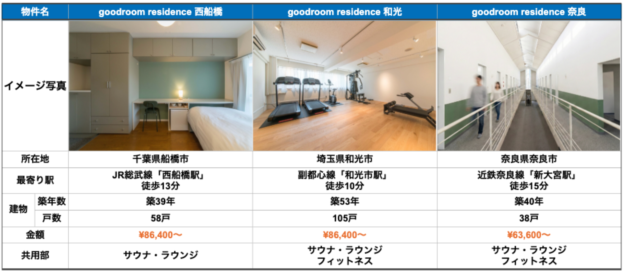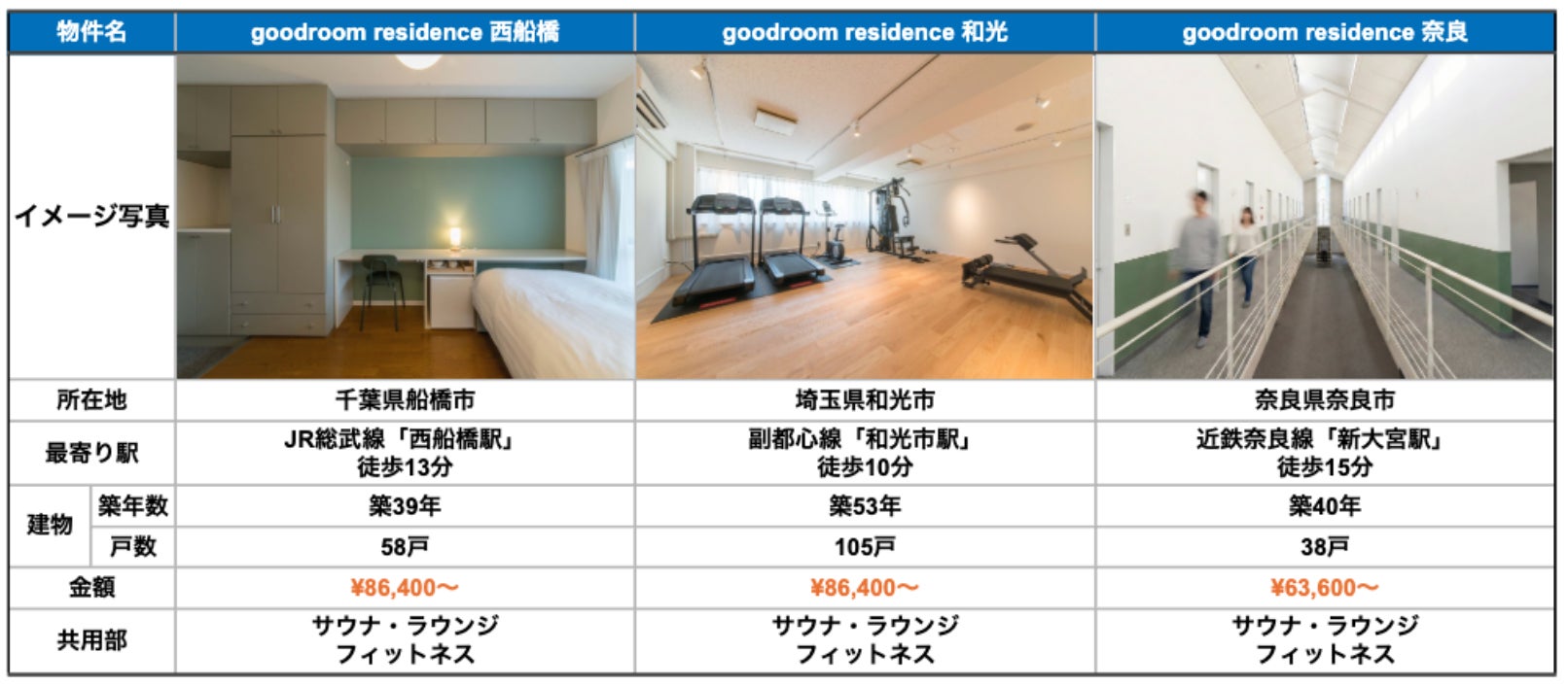 築約40年の旧社員寮の1棟まるごとリノベーションプロジェクト!「goodroom residence 」埼玉・千葉・奈良で3棟同時に今春オープン!