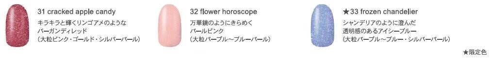 幸福感のあるやわらかな香りで満たしながら、ぷっくりとしたツヤと上質な発色を叶えるネイルカラー。大粒パールで贅沢に輝き、どこか懐かしさを感じる新色2色と透明感のあるブルーの限定色。