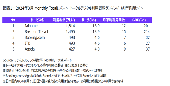 2024年3月のニールセン デジタルコンテンツ視聴率 Monthly Totalレポートによると、旅行カテゴリのうち主にホテルなどの予約を行う「旅行予約サイト」において、PCとモバイルの重複を除いたトータルデジタルの利用者数が最も多かったのは「Jalan.net」で1,814万人、「Rakuten Travel」が1,495万人で続いていました。一方で、GRPが最も高かったのは「Rakuten Travel」で214%、「Jalan.net」が201%で続いていました(図表1)。