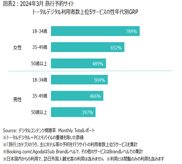 次に、旅行予約サイトにおける利用者数上位5サービスを合計したターゲットGRP(TARP)を性年代別に見ると、2024年3月では女性18-34歳が最も高く789%となっており、女性35-49歳が652%で続いていました。性別で見ると、どの年代でも男性よりも女性のターゲットGRPが高くなっており、年代別でみると、若年層ほどターゲットGRPが高くなっていました(図表2)。