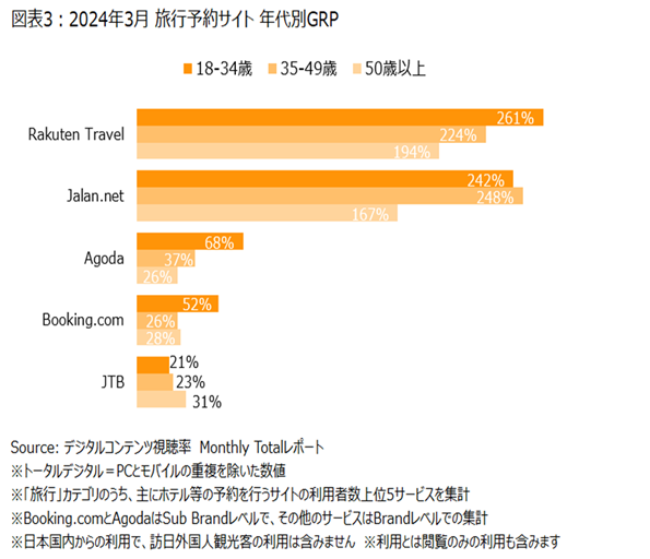 最後に、上位5サービスのターゲットGRP(TARP)を年代別に見ると、18-34歳と50歳以上では「Rakuten Travel」が最も高く、35-49歳では「Jalan.net」が最も高くなっていました。また、「Agoda」と「Booking.com」は他の年代層よりも18-34歳においてターゲットGRPが高くなっていましたが、「JTB」は年齢が高いほどターゲットGRPが高くなっていました(図表3)。