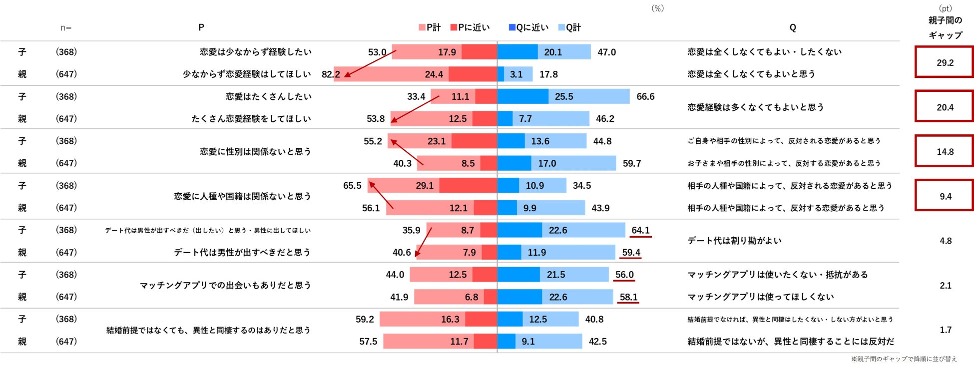 恋愛観において親子で最もギャップが出たのは29.2pt差の「恋愛経験の有無」で、親は8割以上が少なからず恋愛経験をしてほしいと思っているのに対し、Z世代の子どもで恋愛を少なからず経験したいと回答したのは5割強にとどまりました。「恋愛経験の豊富さ」に関する項目でも親は過半数がたくさん経験してほしいと回答しているのに対し、恋愛をたくさんしたいZ世代の子どもは3割強にとどまり、20.4pt差と親子間のギャップが大きく「若者の恋愛離れ」の傾向が色濃く出ています。また「恋愛に性別は関係ない」では14.8pt差、「恋愛に人種や国籍は関係ない」では9.4pt差と恋愛における多様性・ジェンダーに関する項目でもギャップが見られ、Z世代の方が尊重する考えが強いです。デート代については親子ともに「割り勘がよい」と回答する人が6割前後でしたが、親の方がやや「男性が出すべき」と回答する人が多い結果でした。「マッチングアプリでの出会い」では親子間のギャップは見られませんでしたが、親子とも自身が使うのは抵抗がある・子に使ってほしくないと回答する人が過半数でした。また「結婚前提ではない同棲」の受容性でも親子間でほとんどギャップが見られませんでした。