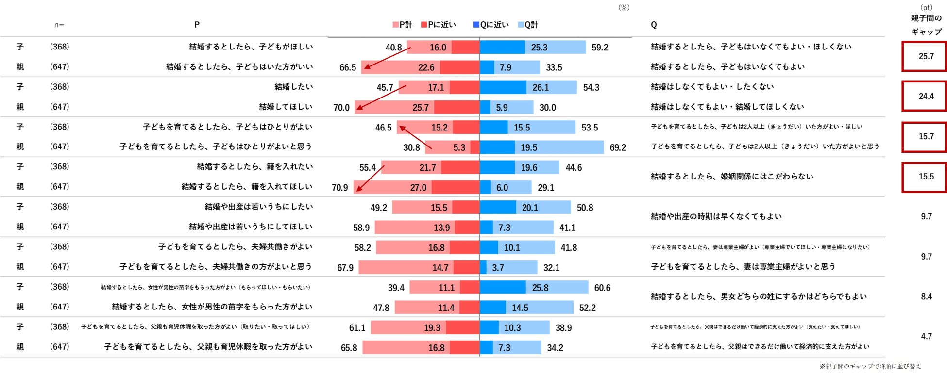 ここからは、Z世代とZ世代の子どもを持つ親に、親子の関係性や恋愛観、仕事観などテーマ別にそれぞれ自身がどのような価値観を持っているかを聴取し、そのギャップを分析しました。