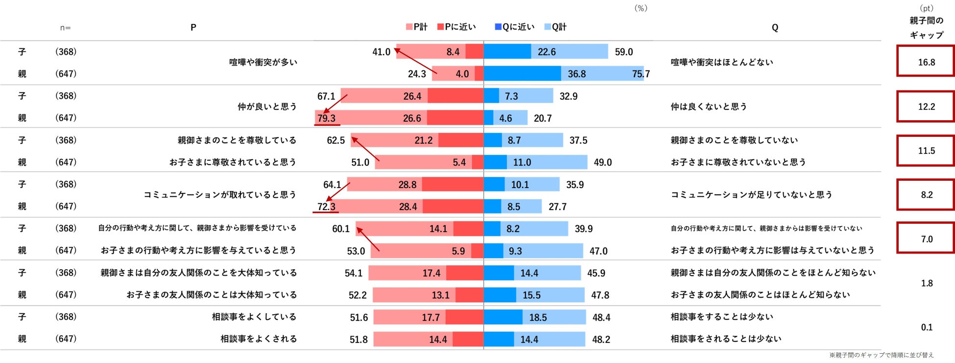 親子の関係性についての考えにおいて、Z世代の子どもと親で最もギャップが出たのは16.8pt差の「喧嘩や衝突の有無」で、Z世代の子どもは4割が多いと感じているのに対し、親は2割強にとどまりました。親は「仲が良いと思う」 「コミュニケーションが取れていると思う」で7割以上のスコアであることからも、Z世代の子どもとの親密性を感じている様子ですが、いずれの項目でもZ世代の子どもとのスコア差は10pt前後と価値観のギャップがあります。一方「子どもの行動や考え方に影響を与えている」「子どもに尊敬されている」という点では親の方が消極的で、Z世代の子どもの「影響を受けている」「尊敬している」スコアよりも下回り、親子のギャップは10pt前後の結果となっています。