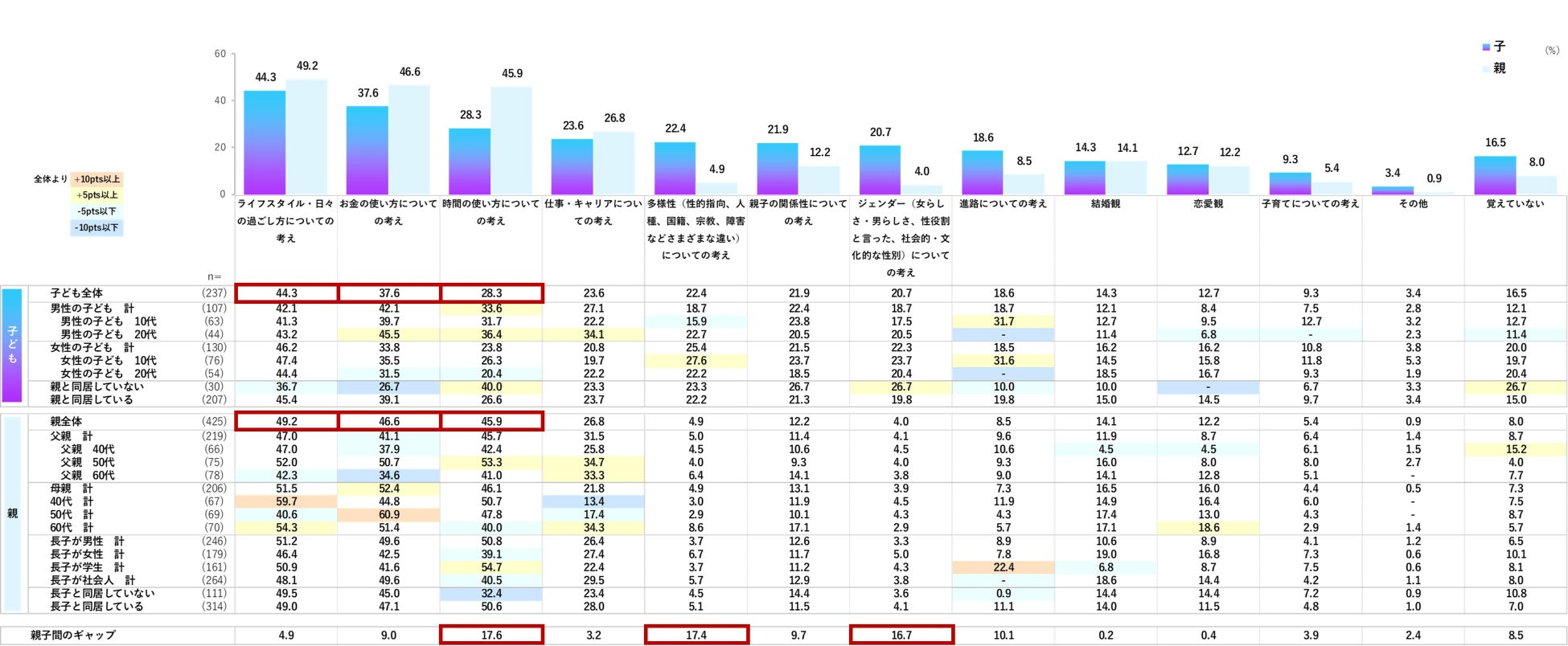 特に親はZ世代の子どもの進路、キャリア、結婚、子育て等の将来の話よりもライフスタイル、お金・時間の使い方といった日常生活において価値観の違いを感じており、「時間の使い方」ではZ世代とのギャップが最も大きい。一方、Z世代は親と比較すると多様性・ジェンダーについての考えで価値観の違いを感じている人が多く、また親よりもスコアが高い項目としてはギャップが最も大きく、多様性を尊重するZ世代の特徴が見える。 またいずれの項目もZ世代よりも親の方が価値観の違いの受容性が高く、子どもの価値観を尊重する考えが見えるものの、価値観の違いを感じている人が多かった時間・お金の使い方についての考えでは比較的受容性が低め。