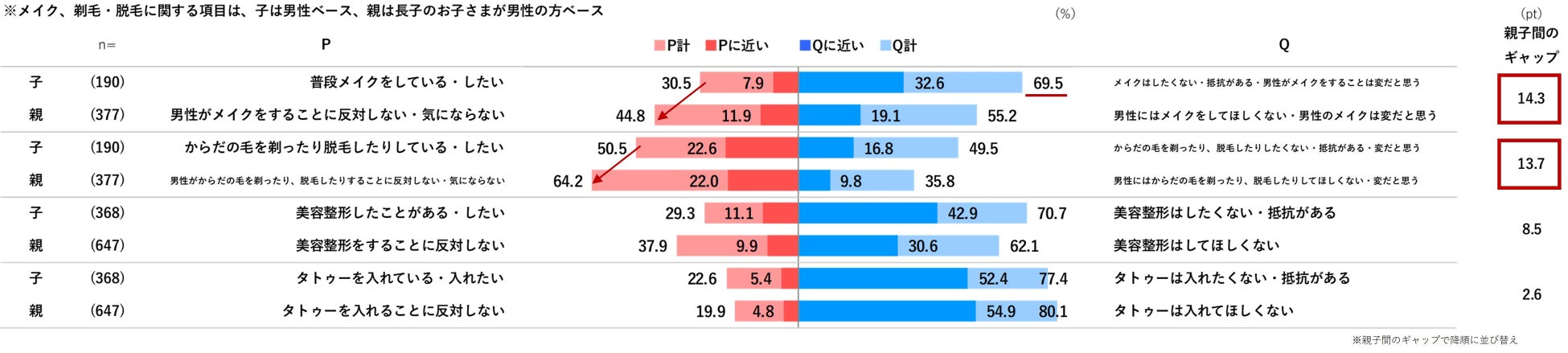 6.男性メイク、男性の剃毛・脱毛はZ世代の実態よりも親の理解の方が進んでいる。美容整形やタトゥーといった永続的に影響が出るものはまだ親子ともに抵抗感が強い様子。