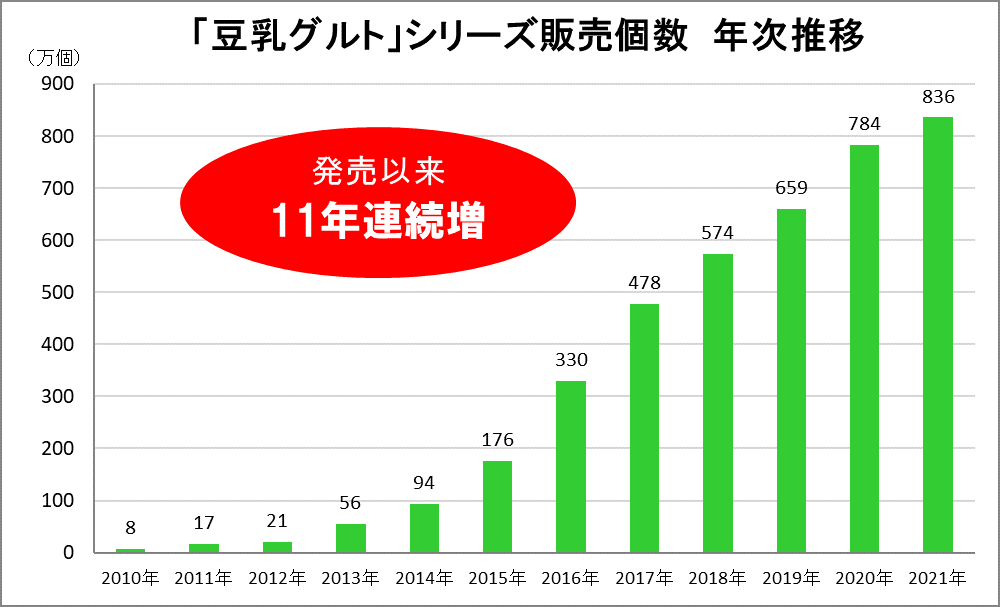 「豆乳グルト」シリーズは、2010 年 4 月の発売から 11 年連続で伸長しております。