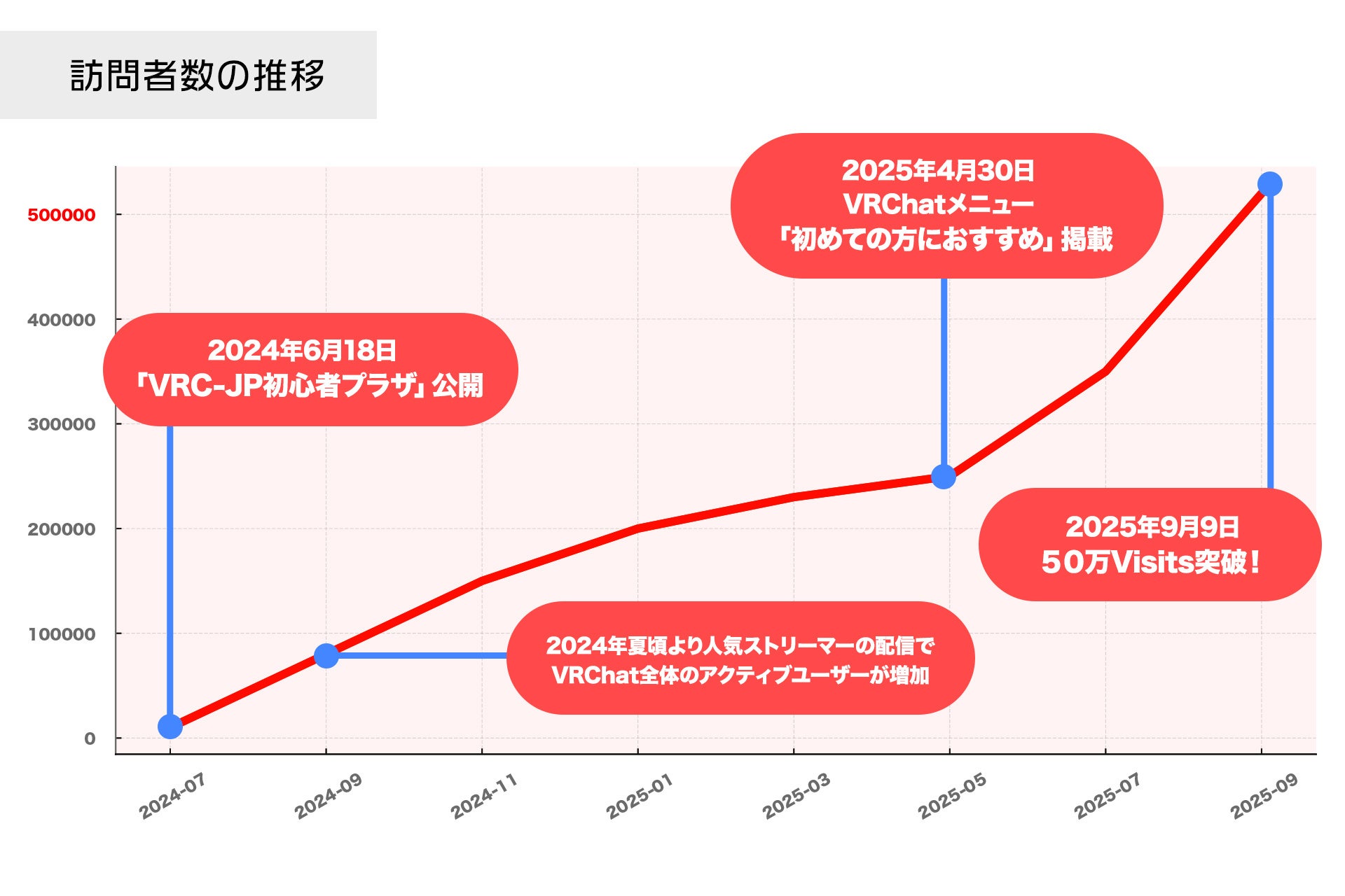 『VRC-JP 初心者プラザ』は、2024年6月18日の公開以降、約一年で訪問者数は30万を超え、2025年4月30日にはVRChatのワールドメニューの「初めての方におすすめ」に加わったことで訪問者数が急増し、2025年9月現在では50万を突破しました。