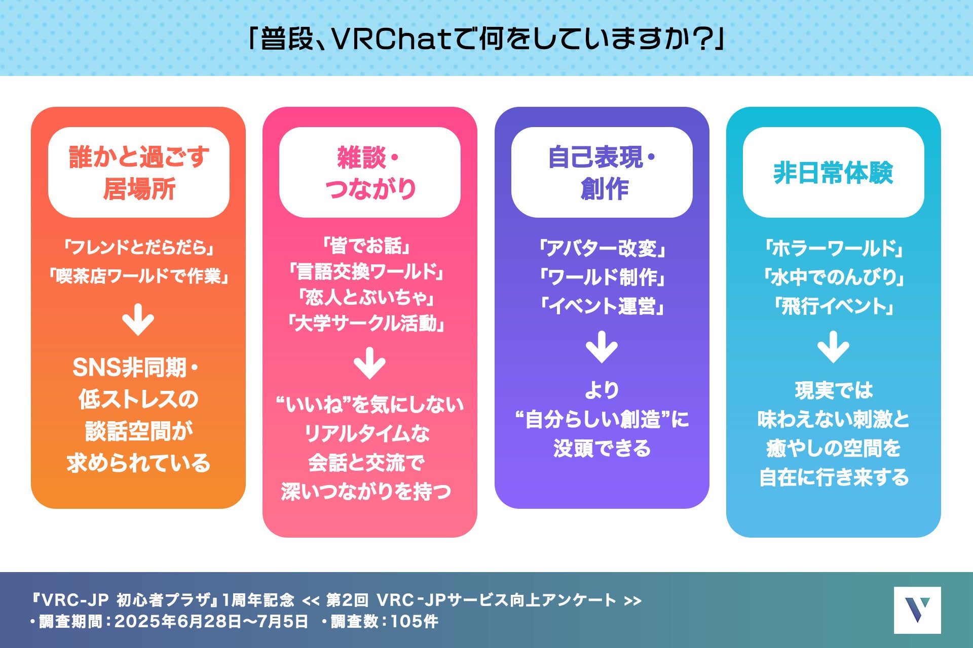 また、アバターやワールドを通じて偶発的な出会いを楽しみ、ゆるやかな雑談を中心に過ごすという、目的のない出会いとつながりにより、緊張を和らげる「余白」を提供しています。