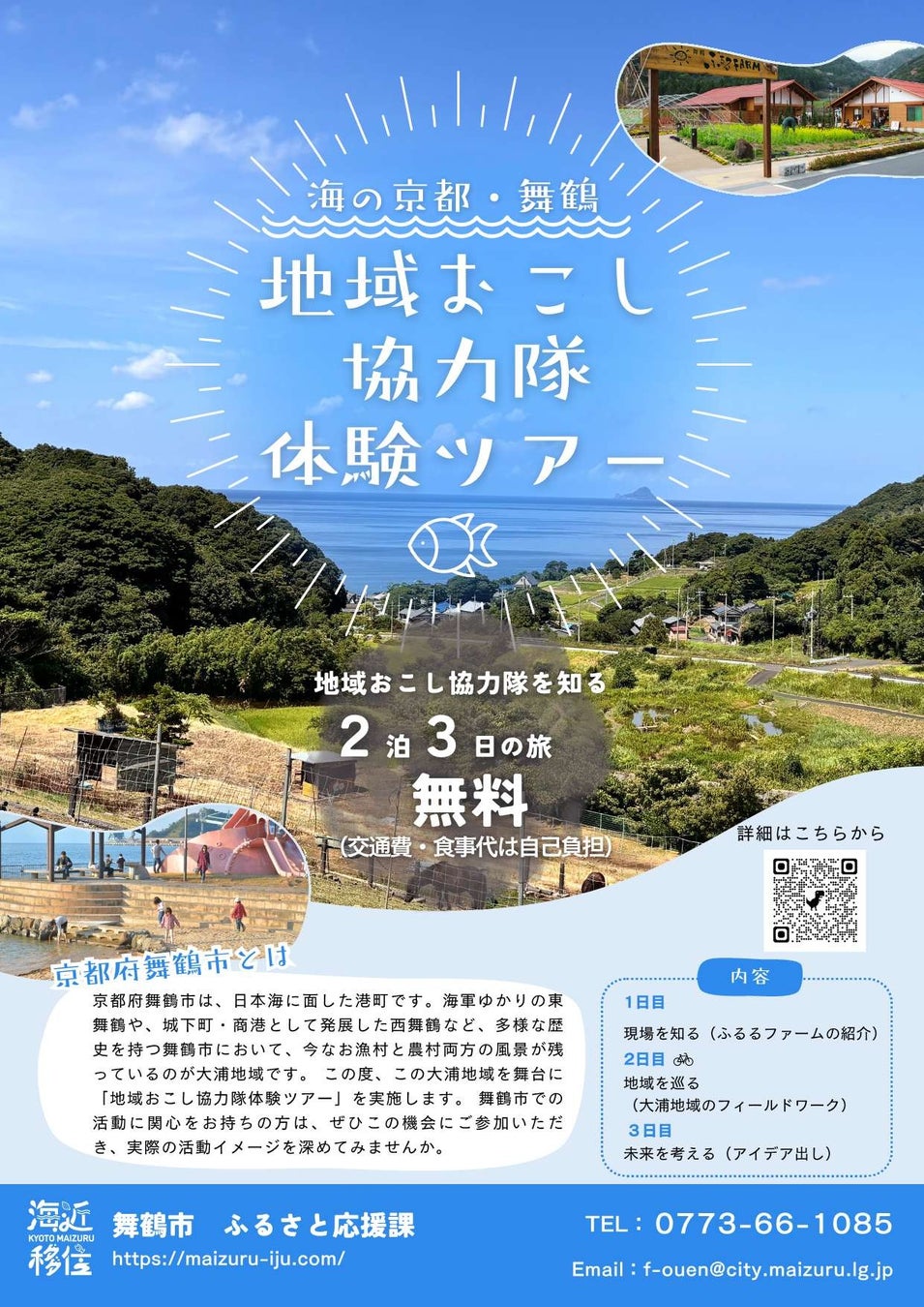 京都府舞鶴市は、令和8年2月から3月にかけて、地域おこし協力隊への応募検討者を対象とした2泊3日の体験ツアー「おためし地域おこし協力隊」を実施します 。実際の活動現場である大浦地域でのフィールドワークを通じ、具体的な活動をイメージしていただきます。