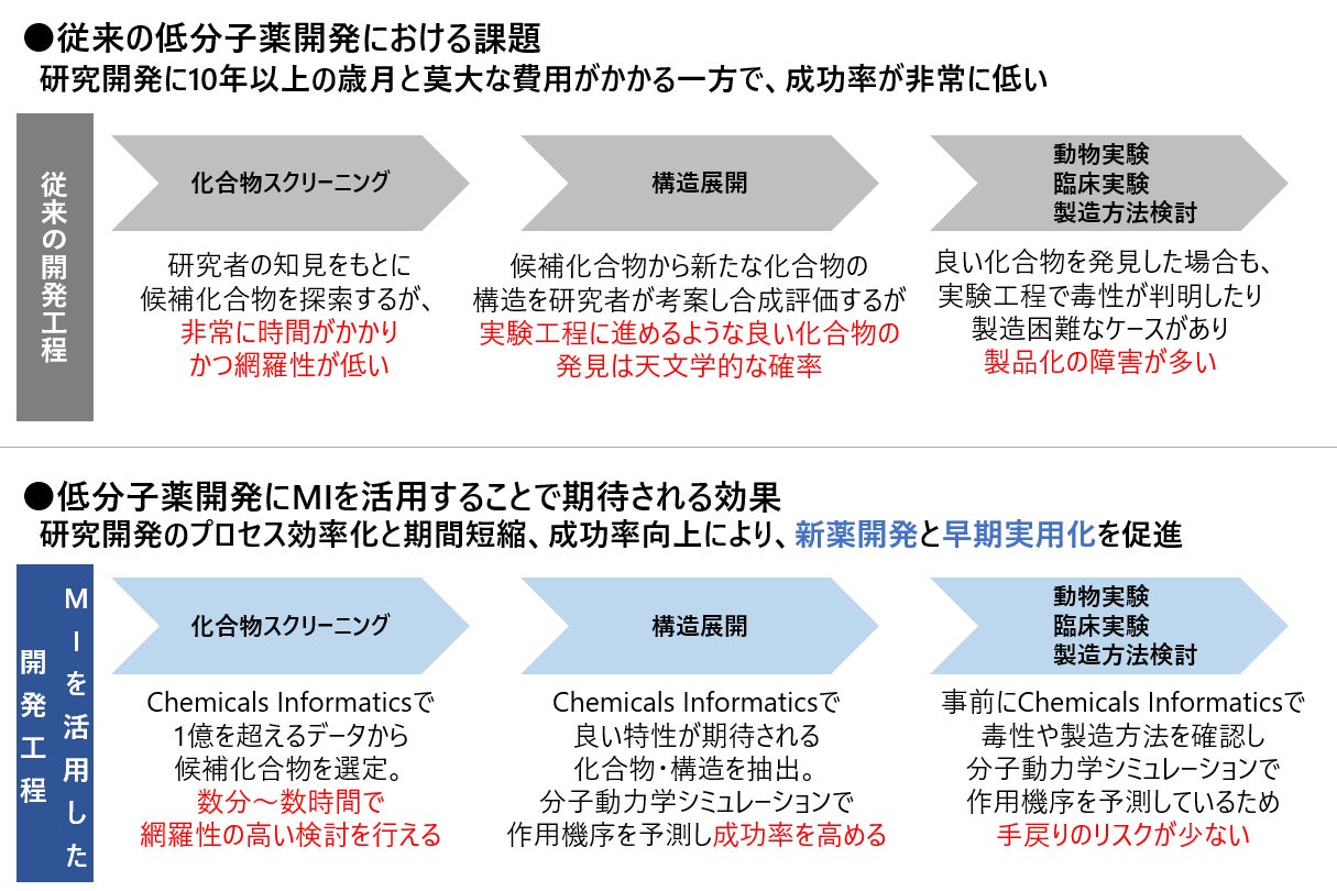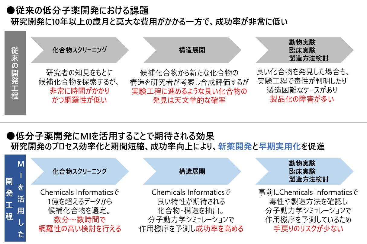低分子薬は現代における主流の医薬品で、近年はがんの原因となるたんぱく質の作用を阻害する分子標的薬*2としてなど、その用途拡大への期待が高まっています。従来、低分子薬の開発は、大量の既存化合物を収録する化合物ライブラリーの中から、研究者の知見や経験などに基づき候補化合物を複数選定し、実験を繰り返すことで化合物構造の調整や作用機序の解明を行い、臨床試験へと進むプロセスをとってきました。そのため、研究開発には10年以上の歳月と莫大な費用がかかる一方で、成功率は非常に低いという課題がありました。このような課題の解決策として期待されているのが、AIなどの情報科学の手法により化合物・材料開発を高効率化する技術であるMIです。
