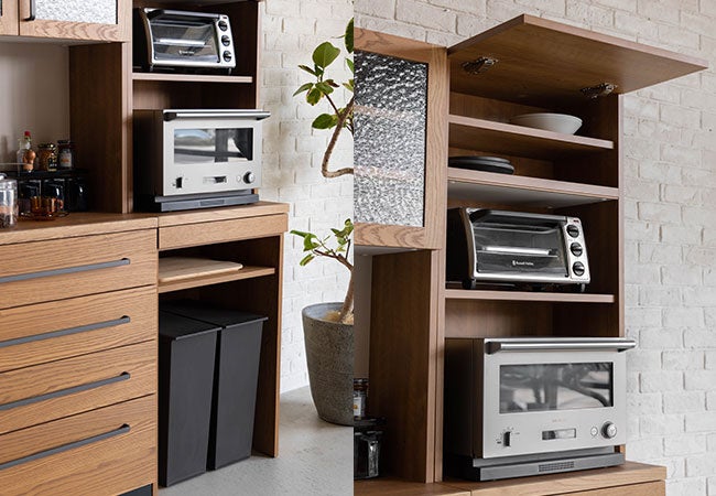 他にも、日常のお手入れがしやすいようにカウンター天板は傷や汚れ、熱に強いメラミン樹脂加工を施し、オープン部分上部には、水蒸気を調湿しカビや劣化から守るモイスを設置するなど、使い勝手や毎日のお手入れのしやすさに配慮して設計しています。