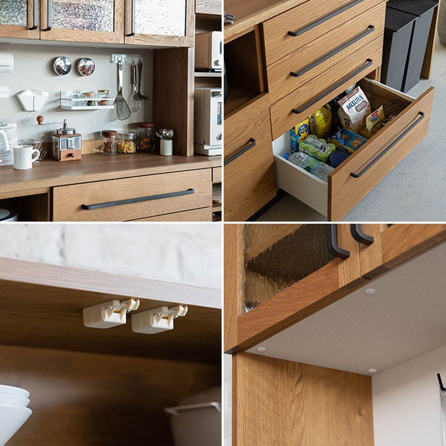 また、引出しも4杯あり開き収納も合わせれば、収納力も十分。開き戸には耐震ラッチがついており、地震を感知すると扉をロックし食器などが飛び出すのを防いでくれるので安心です。